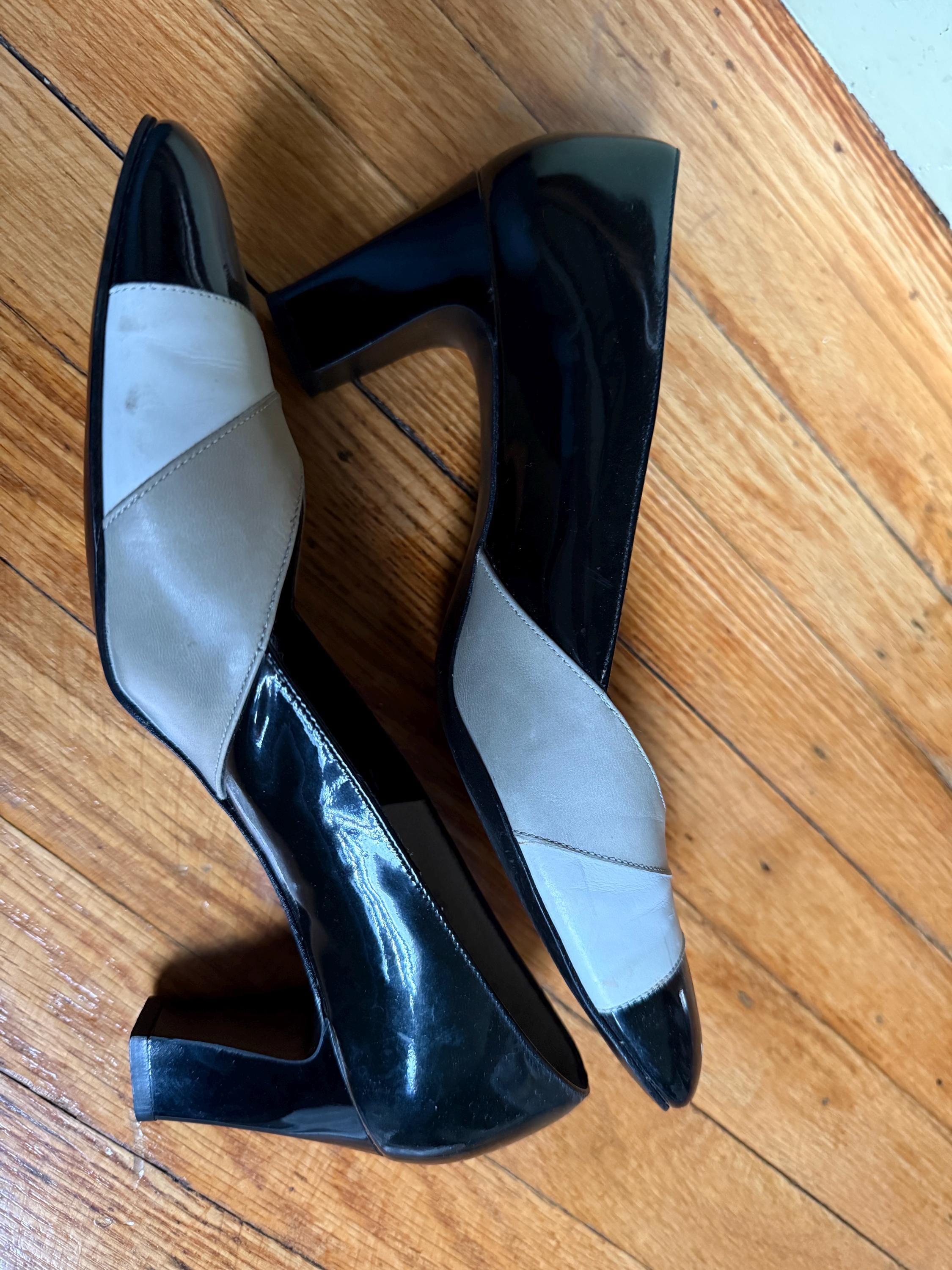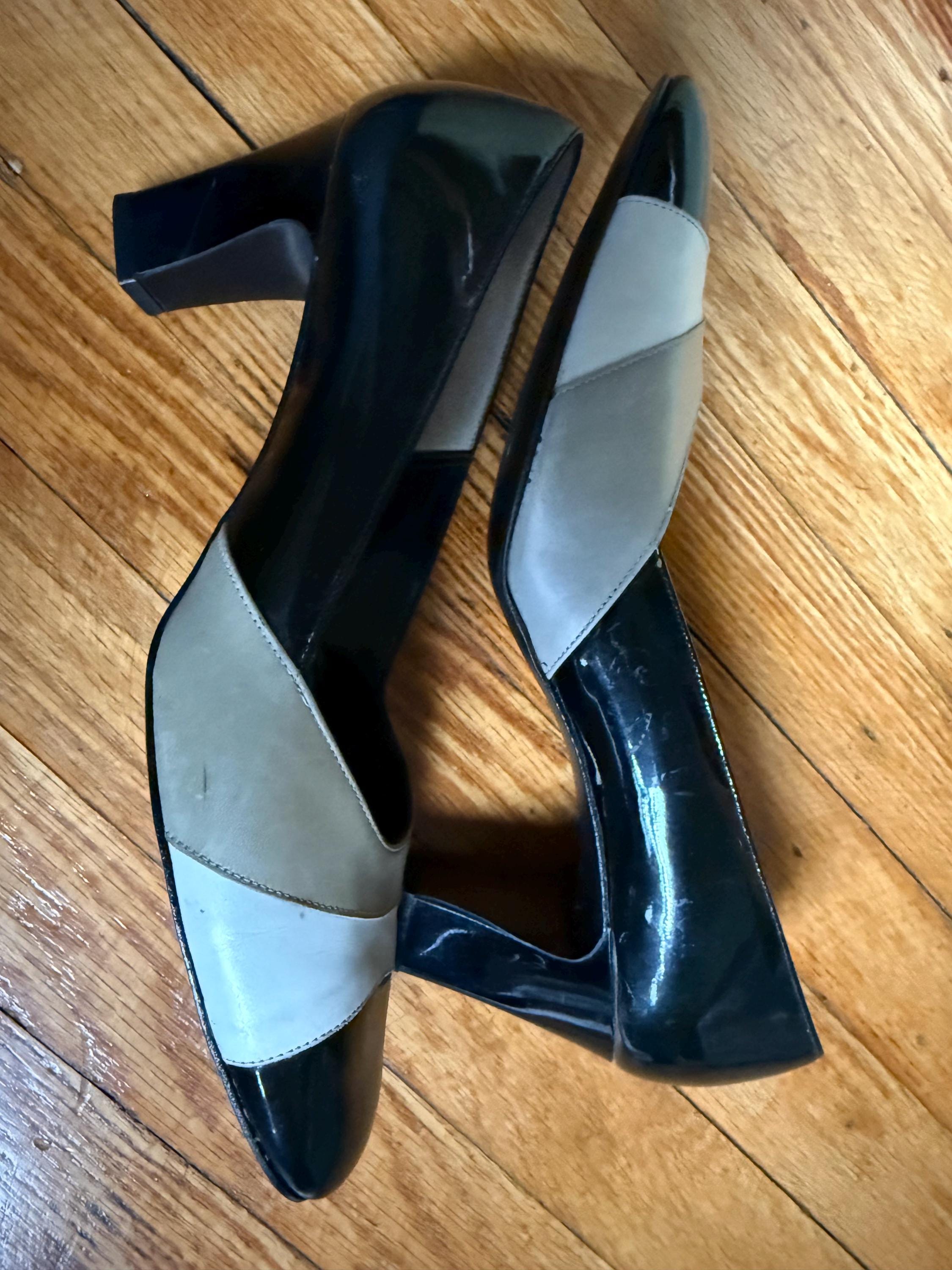 Here’s a smart pair of heels: tri-colored in neutrals to go with any outfit; a chunky heel for comfort; on-trend round toe. Made by Joyce of California, they have a (beige and cream) leather and (black) patent leather upper and are marked a size 7 AA. These shoes have been gently worn and are in great vintage condition.