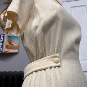 This is a 1960s long sleeved, short dress with a dramatic lace collar and cuffs, accented with soft velvet ribbons. It is giving me Wednesday Addams vibes and is really a sweet and fancy look. It is made my Cardinal of Detroit and I believe that the dress has been hemmed to its current length. It has a double breasted snap closure at the front of the bodice and the fabric feels like a cotton blend with a satin finish. The box pleated skirt gives the dress a nice silhouette. The white lace at the collar and cuffs is a bit yellowed from age and normal wear. Otherwise, this dress is in excellent vintage condition.