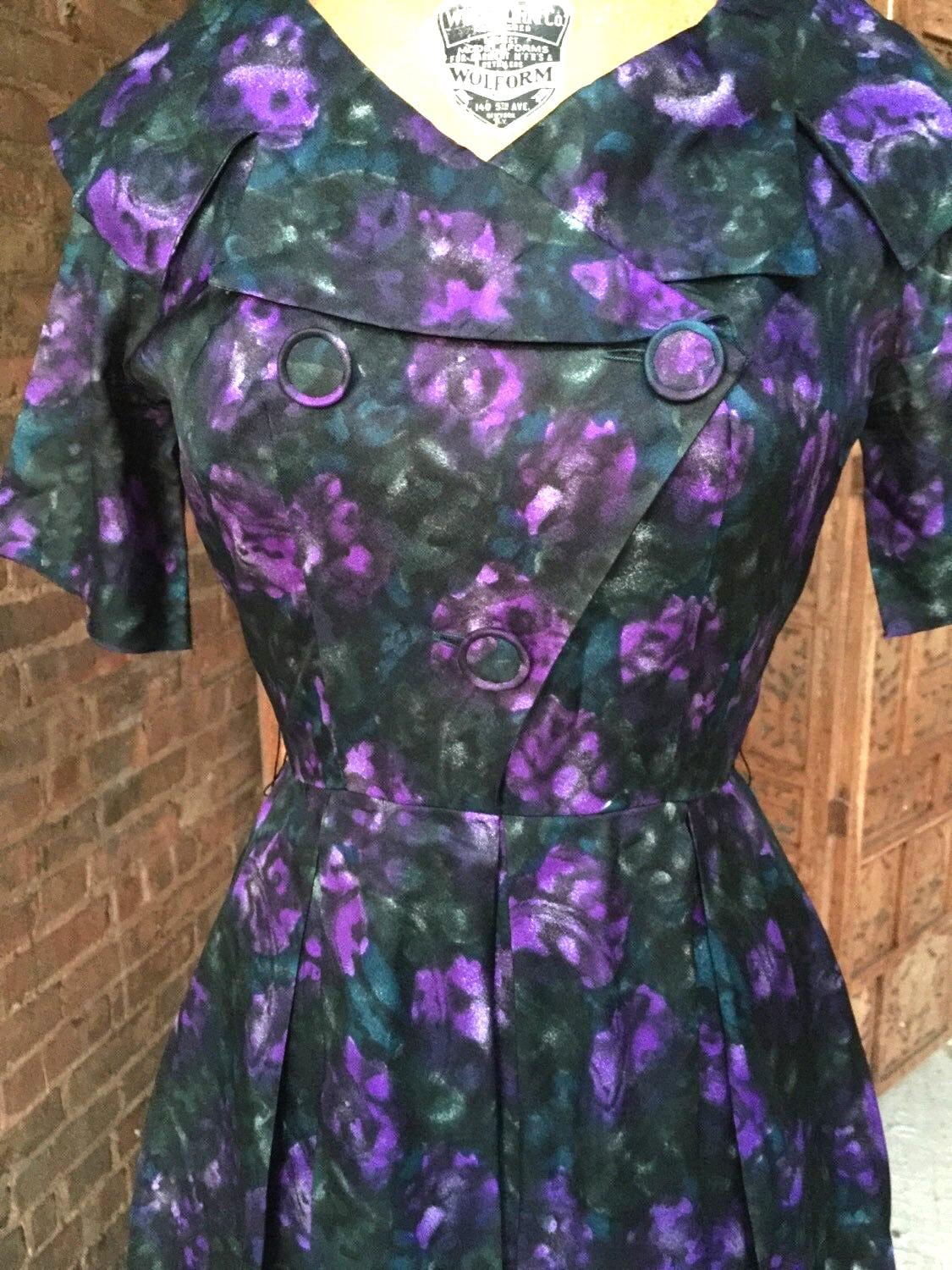 This is a gorgeous day dress from the 1950s with a beautiful dark watercolor print of purple flowers on a dark green and black background. The purple flowers have some nice white highlighting which allows the colors to really pop even though this is such a dark palette. The double breasted detail and the wide lapel that lays on the shoulders really make the dress. The box pleats allow for a full skirt that lays nice and flat at the waist. This dress is in mint vintage condition and may even be deadstock. The tag reads J. Harlan Originals, 100% acetate, size 10. This vintage size 10 is a contemporary size 4. The measurements are as follows: Waist: 26" Bust: 36" Length from CB neck to waist: 15" Length from waist to hem: 27" Shoulder to shoulder: 15" Sleeve: 9 1/2" We do not accept returns on vintage items, so please do not hesitate to message me with any and all questions.