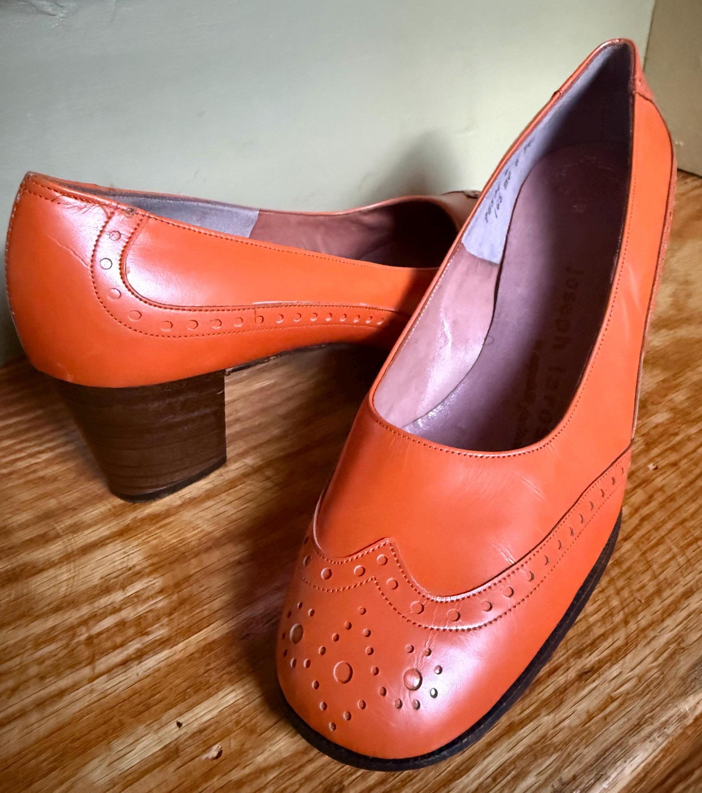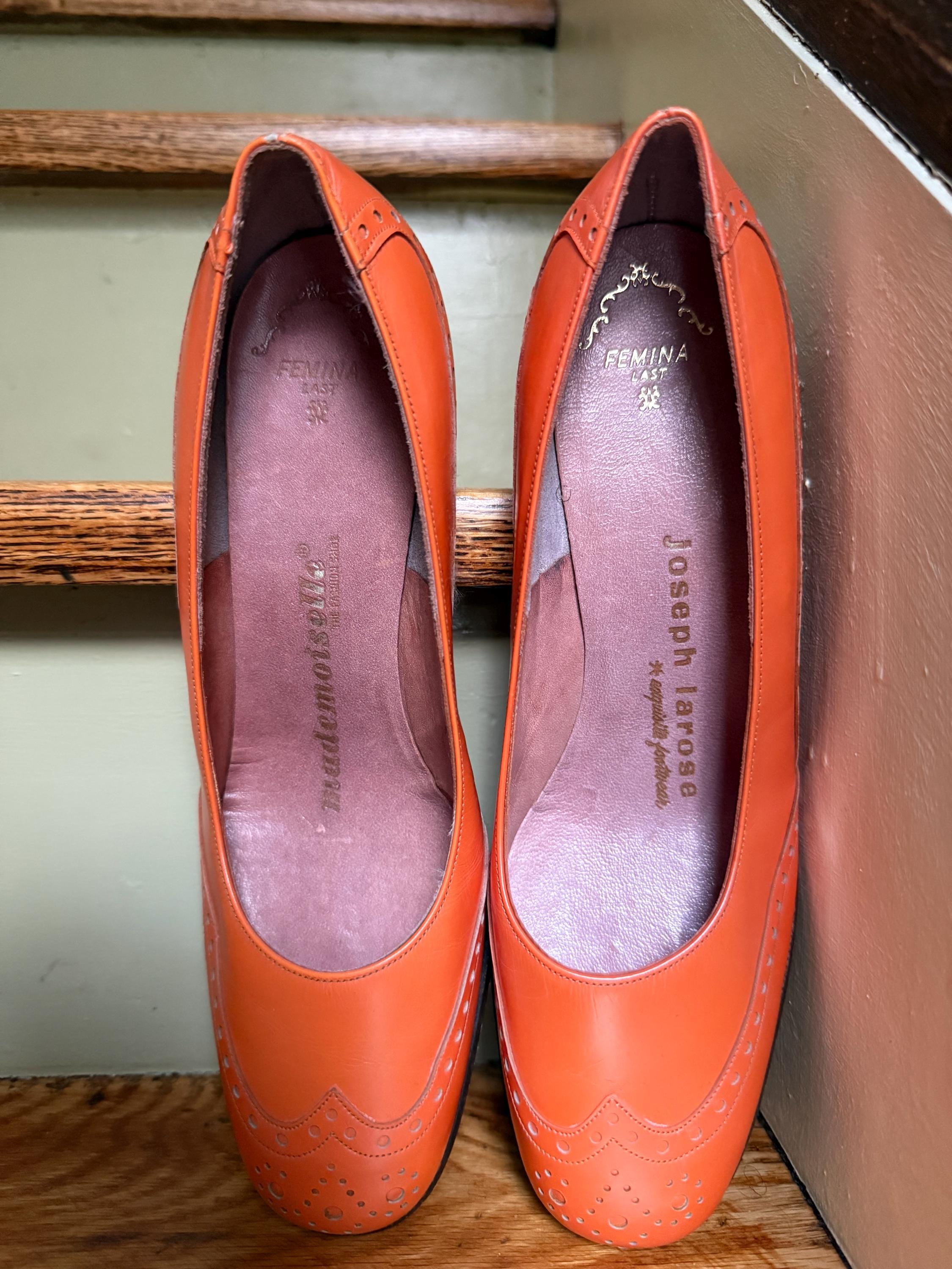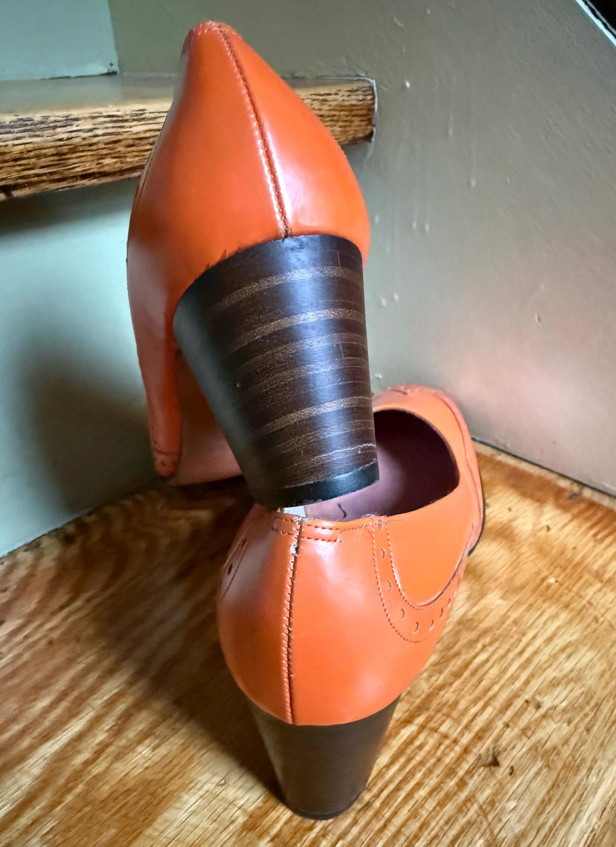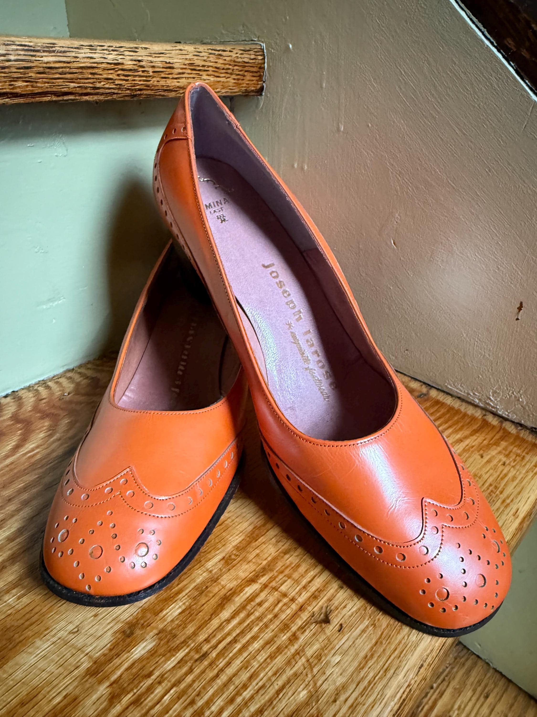 Joseph Larose new old stock; straight outta the warehouse, never worn and well preserved. This is a beautiful pair of leather heels! They are in excellent condition. A feminine wingtip in orange, they’d be perfect for the office, but even better with a pair of jeans. The stacked heel is the perfect size and the leather sole will keep these shoes in rotation for a long time. They are marked a size 6B Femina last. This is the pair of heels that your collection has been waiting for!