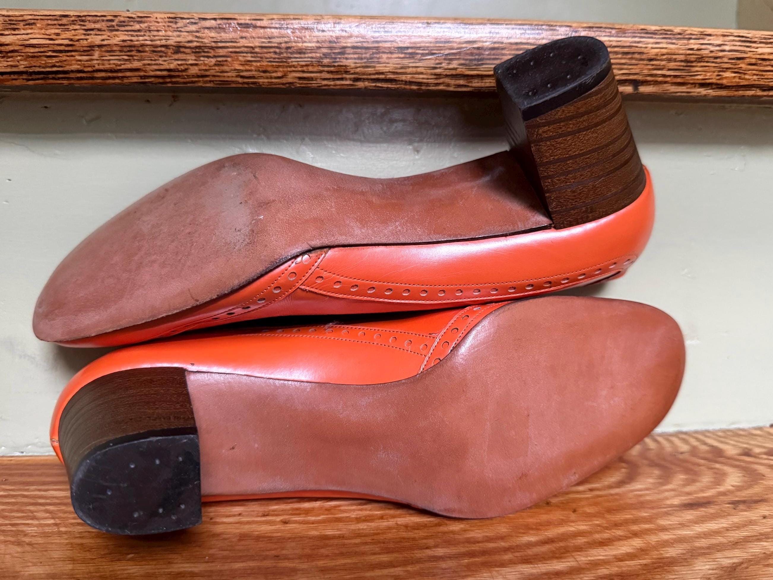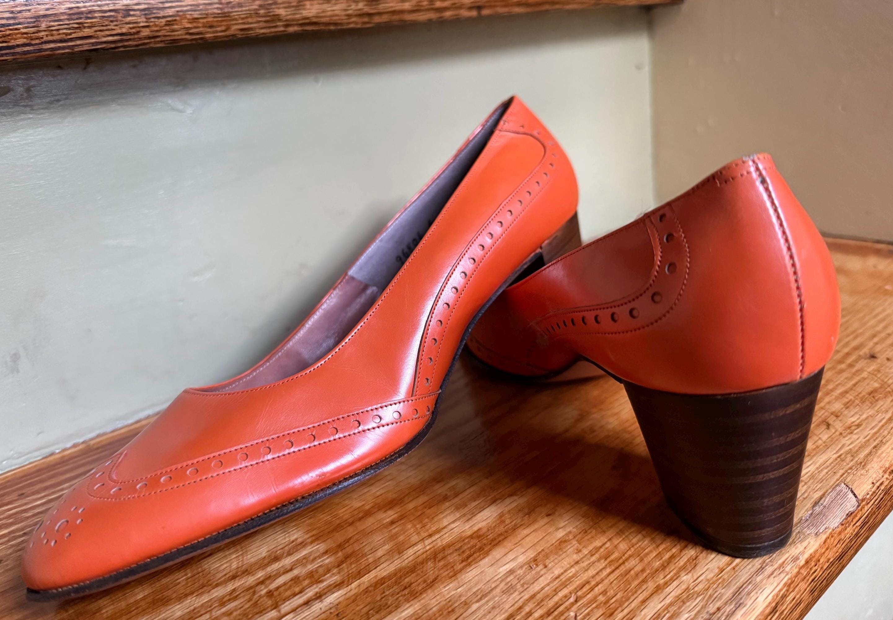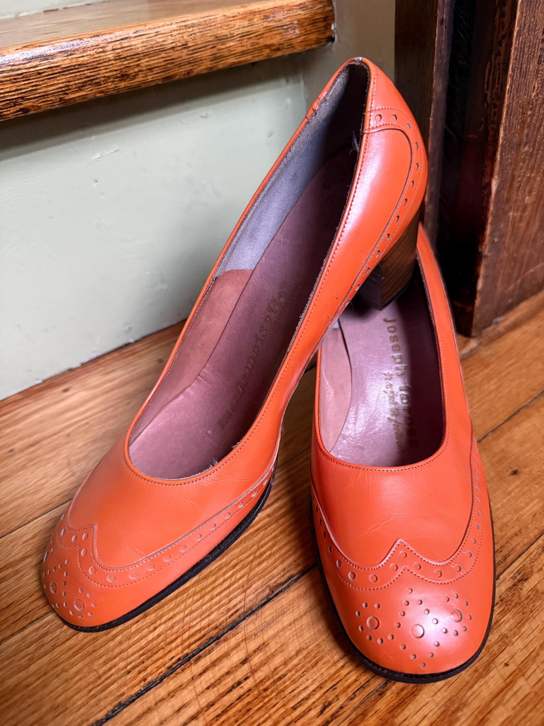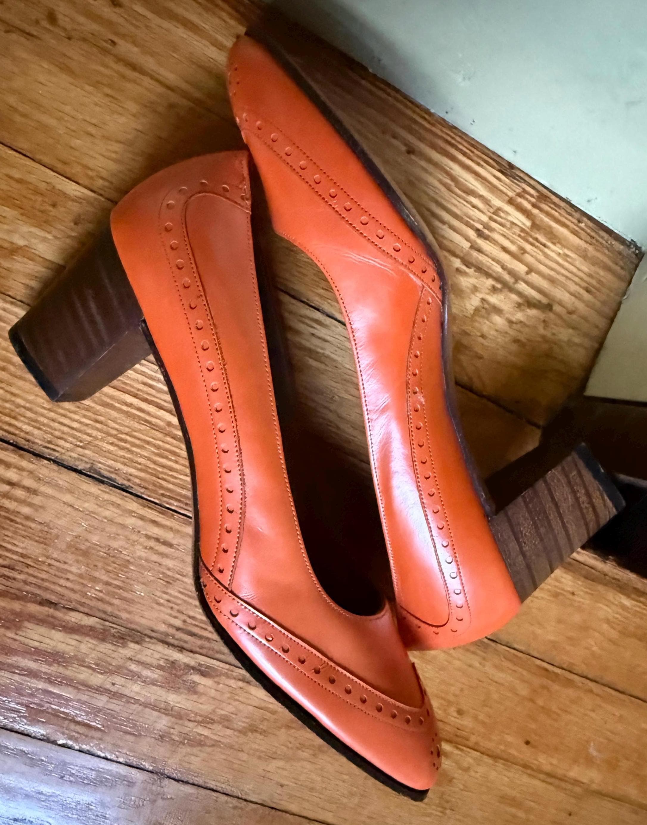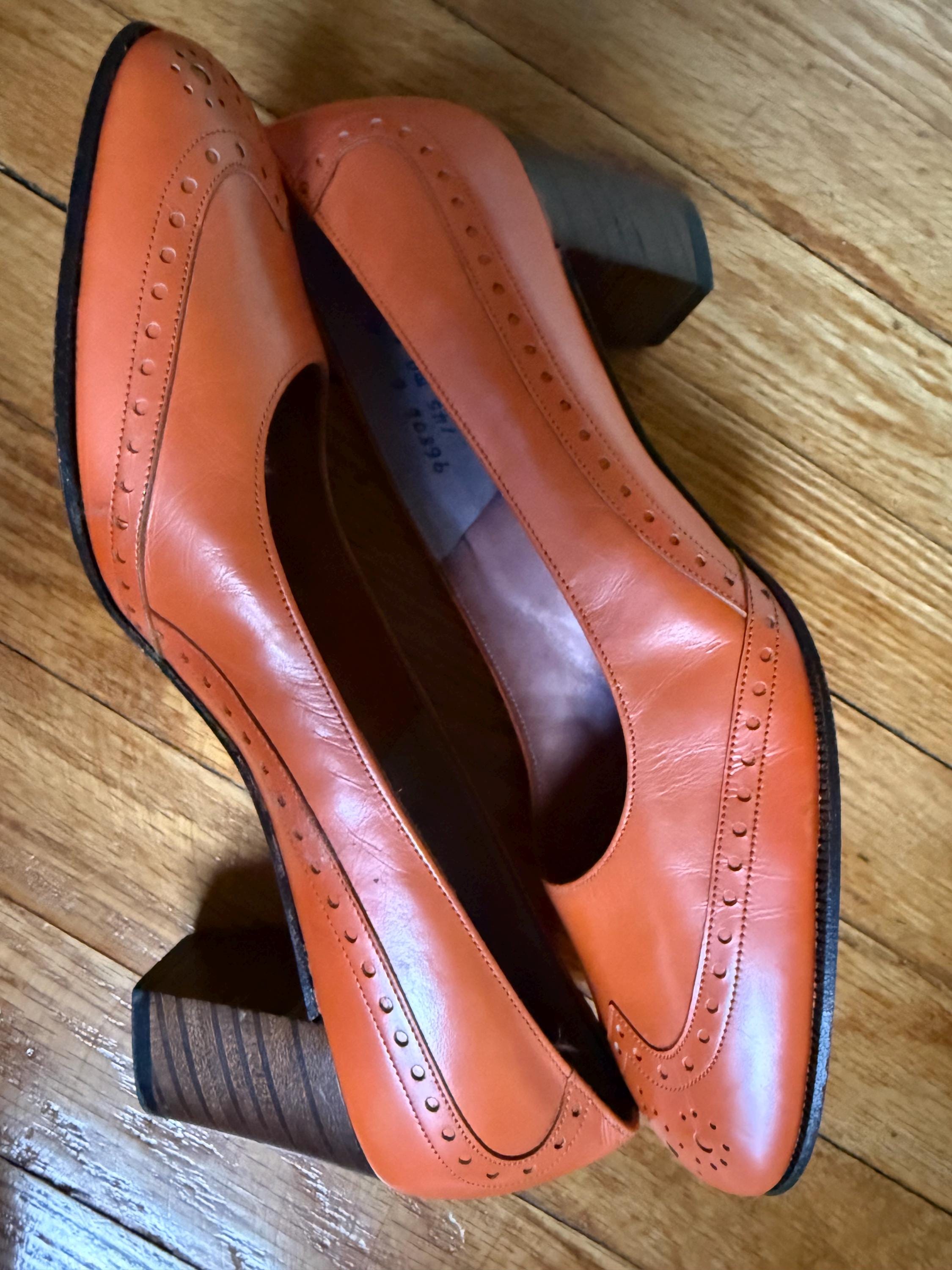 Joseph Larose new old stock; straight outta the warehouse, never worn and well preserved. This is a beautiful pair of leather heels! They are in excellent condition. A feminine wingtip in orange, they’d be perfect for the office, but even better with a pair of jeans. The stacked heel is the perfect size and the leather sole will keep these shoes in rotation for a long time. They are marked a size 6B Femina last. This is the pair of heels that your collection has been waiting for!