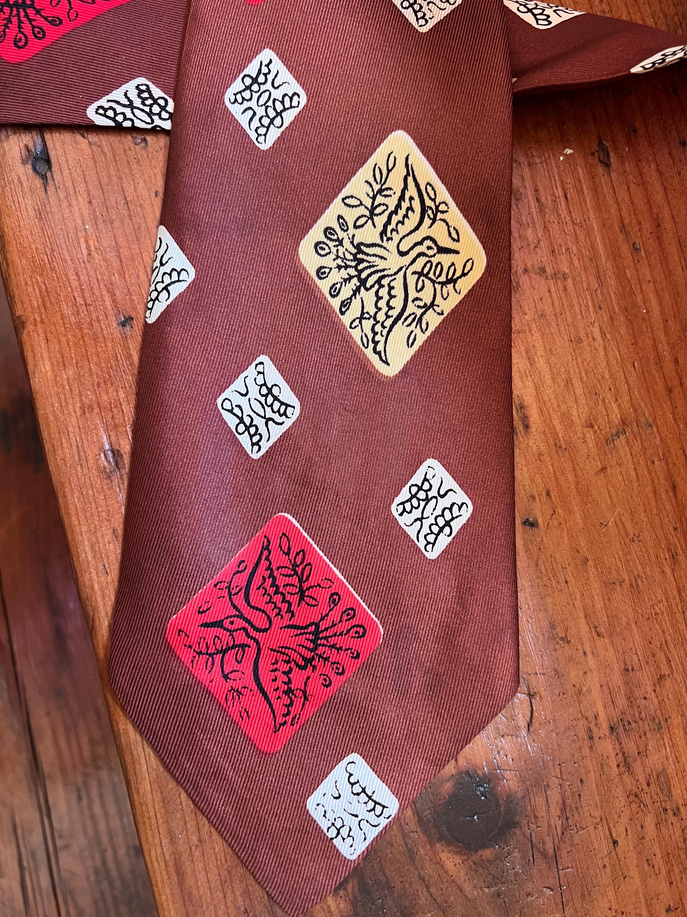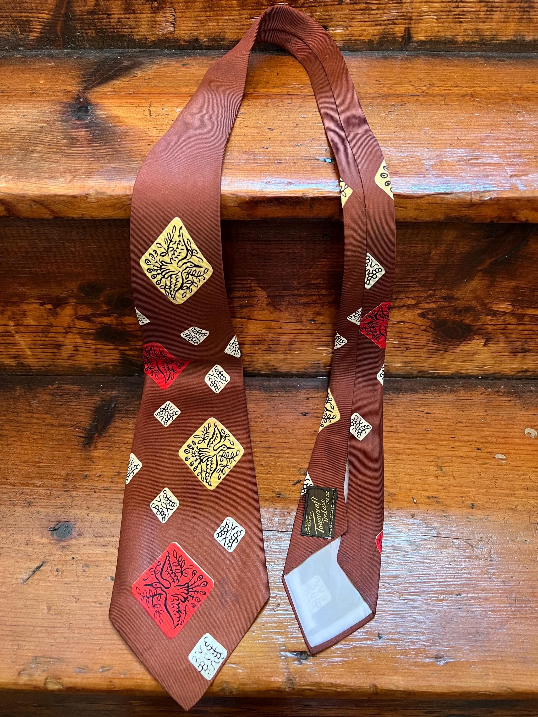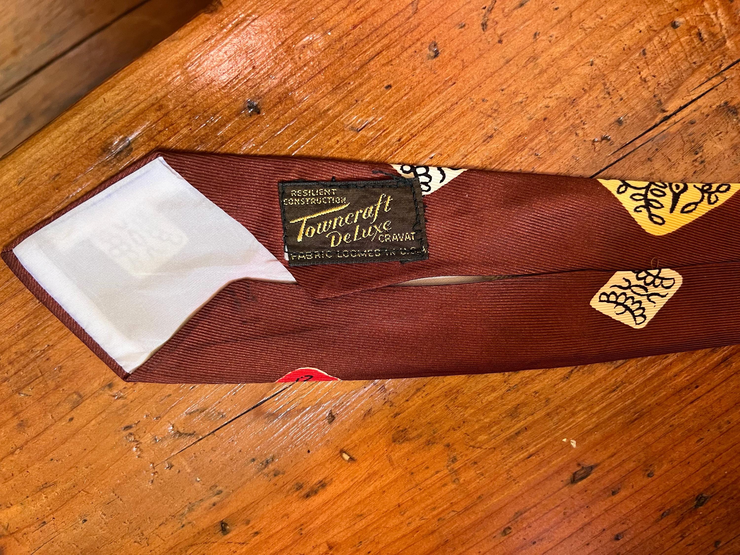 This is a 1950s Towncraft Deluxe cravat. It is in excellent condition with the tag intact, but missing some stitches around the edge of the tag. The fabric feels like silk, but is probably a blend with synthetic fibers. The chocolate brown base color is offset with red, yellow, and white diamonds containing ‘hand-drawn’ peacocks and floral designs. This necktie would be a versatile addition to any collection!