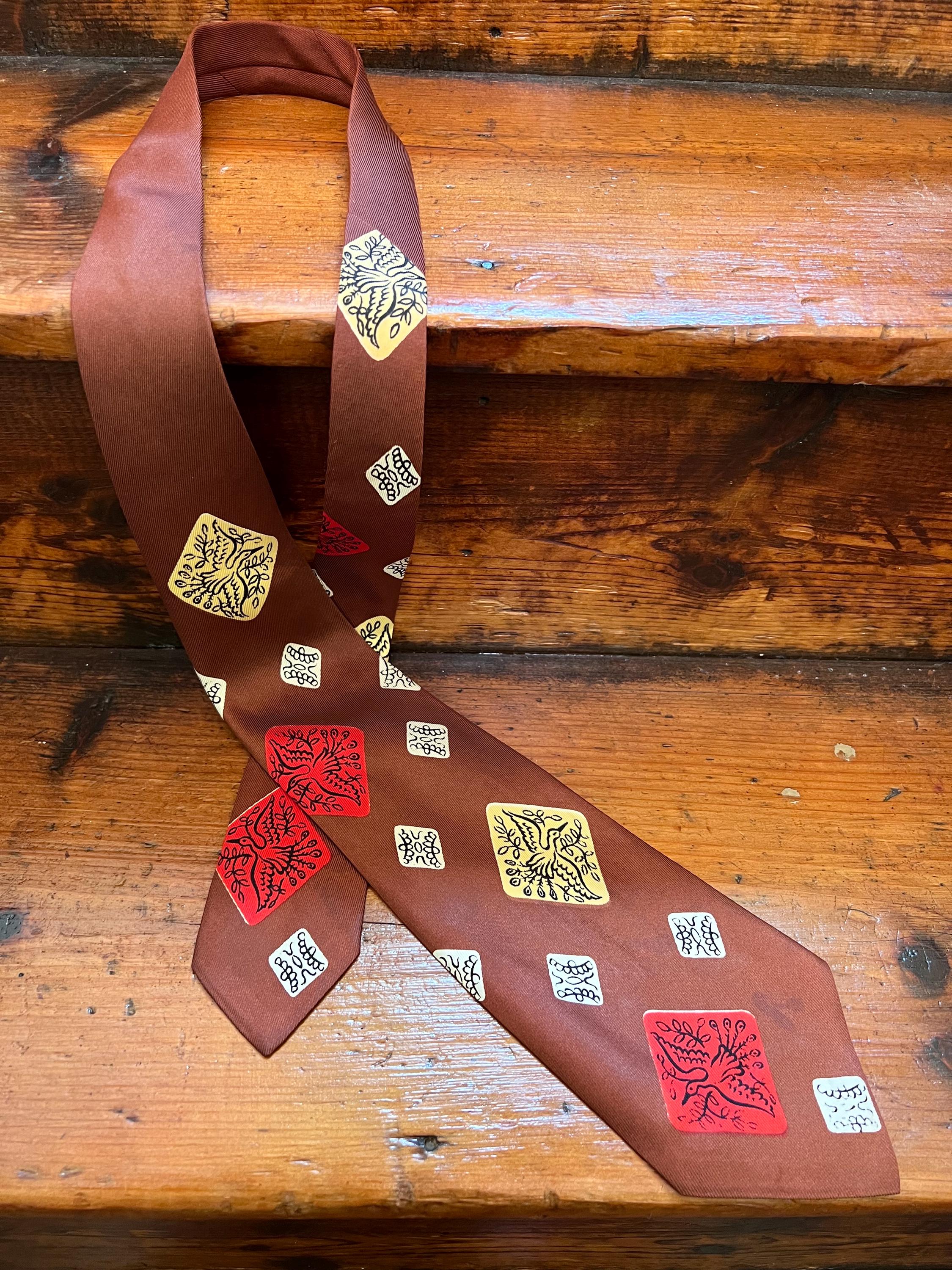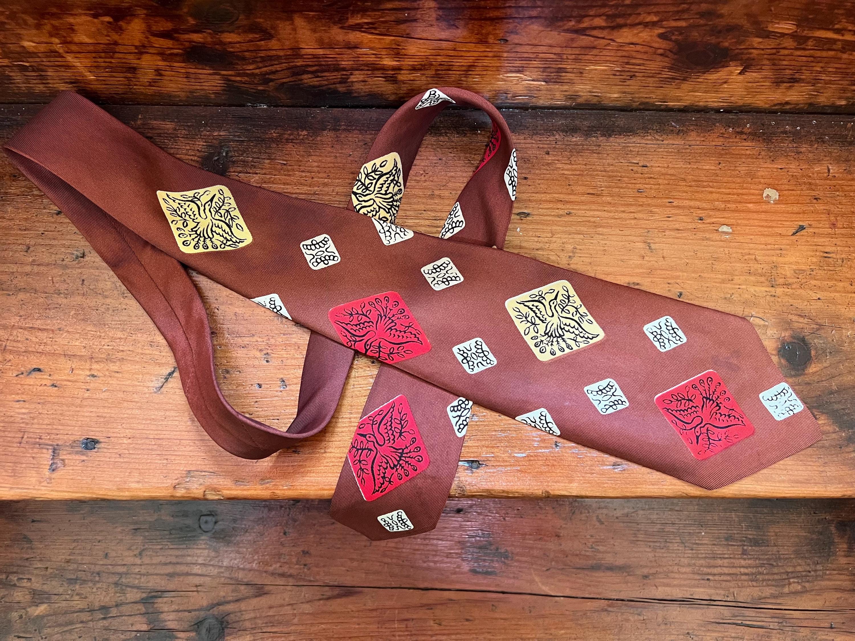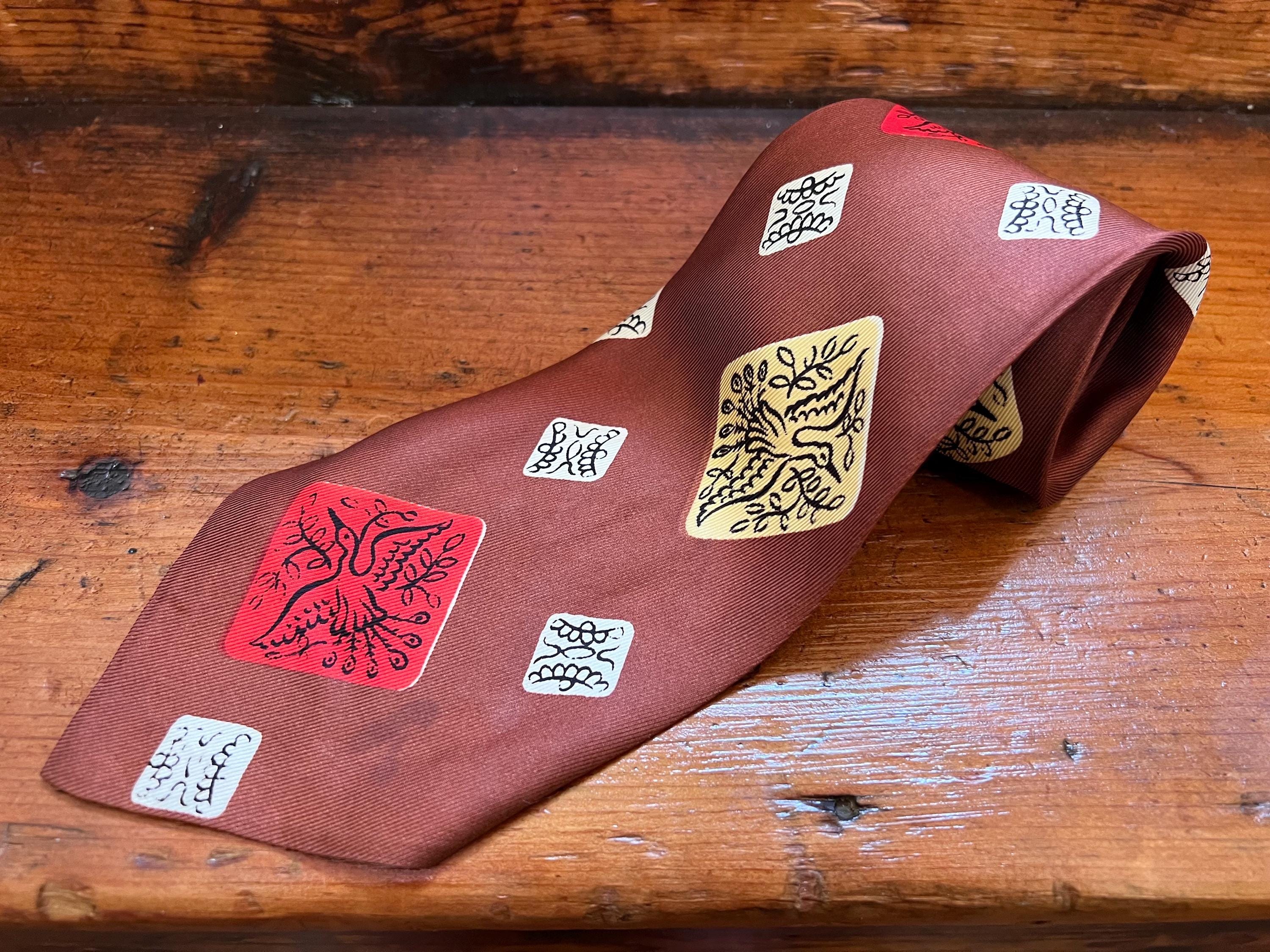 This is a 1950s Towncraft Deluxe cravat. It is in excellent condition with the tag intact, but missing some stitches around the edge of the tag. The fabric feels like silk, but is probably a blend with synthetic fibers. The chocolate brown base color is offset with red, yellow, and white diamonds containing ‘hand-drawn’ peacocks and floral designs. This necktie would be a versatile addition to any collection!