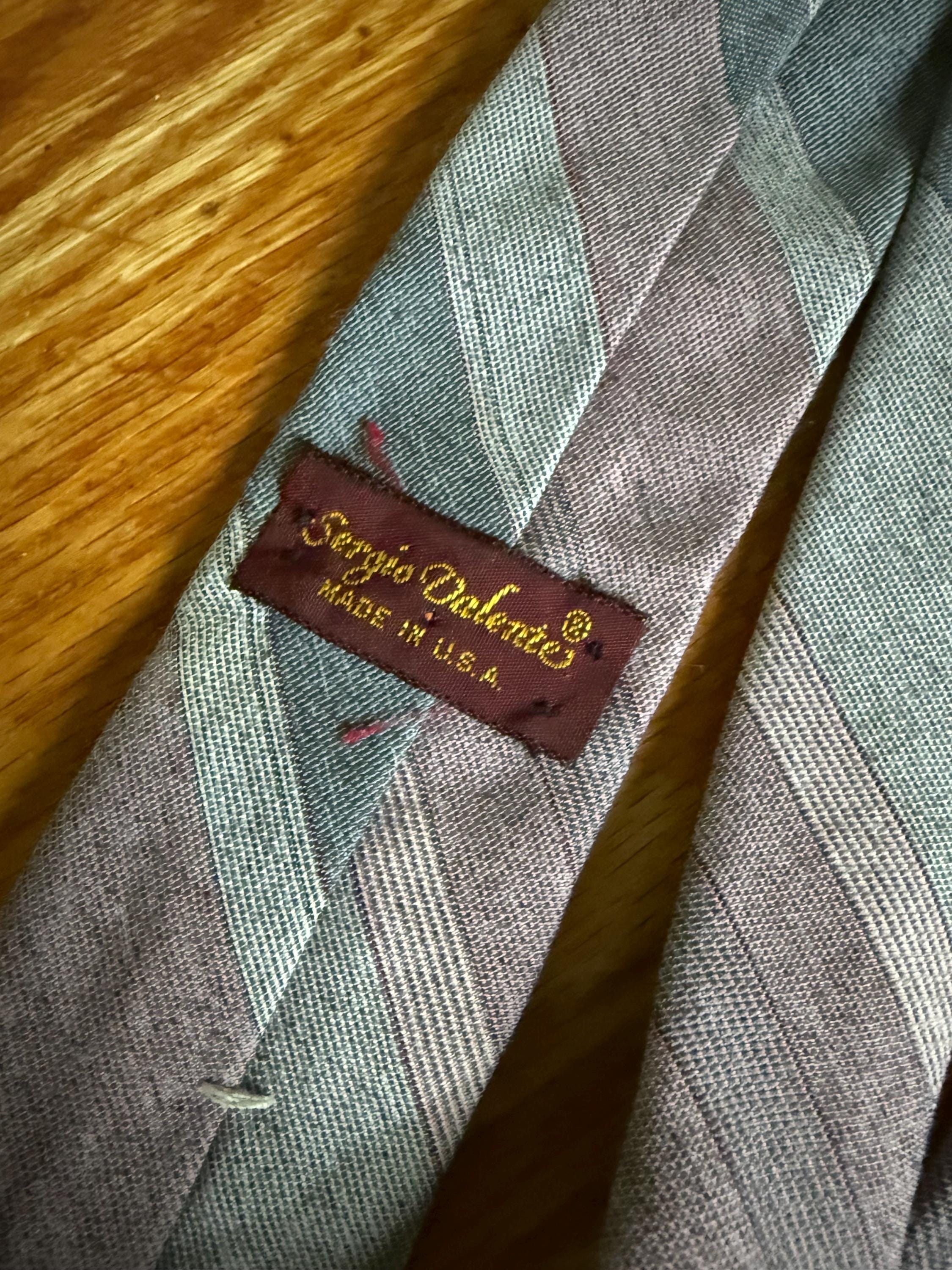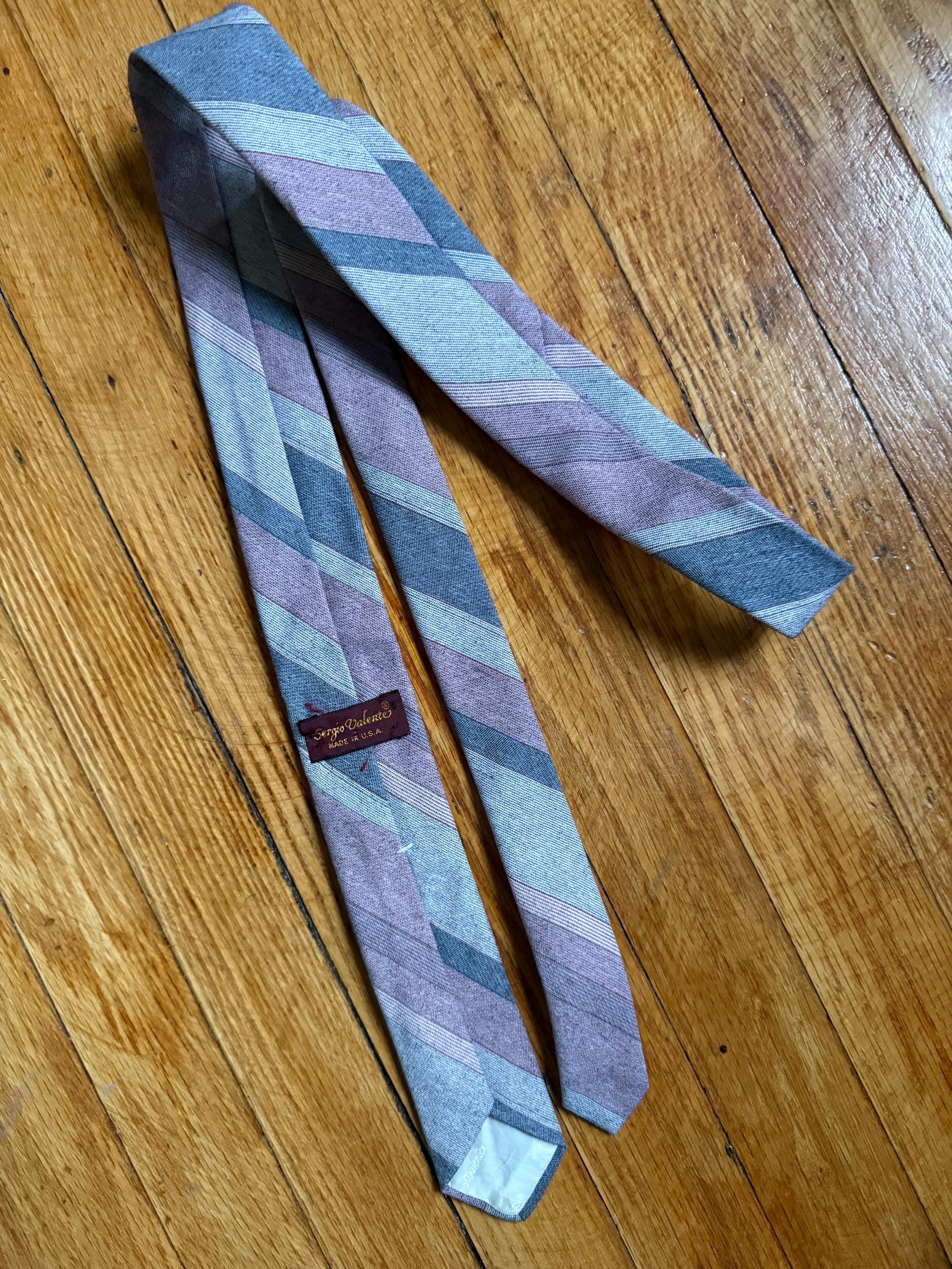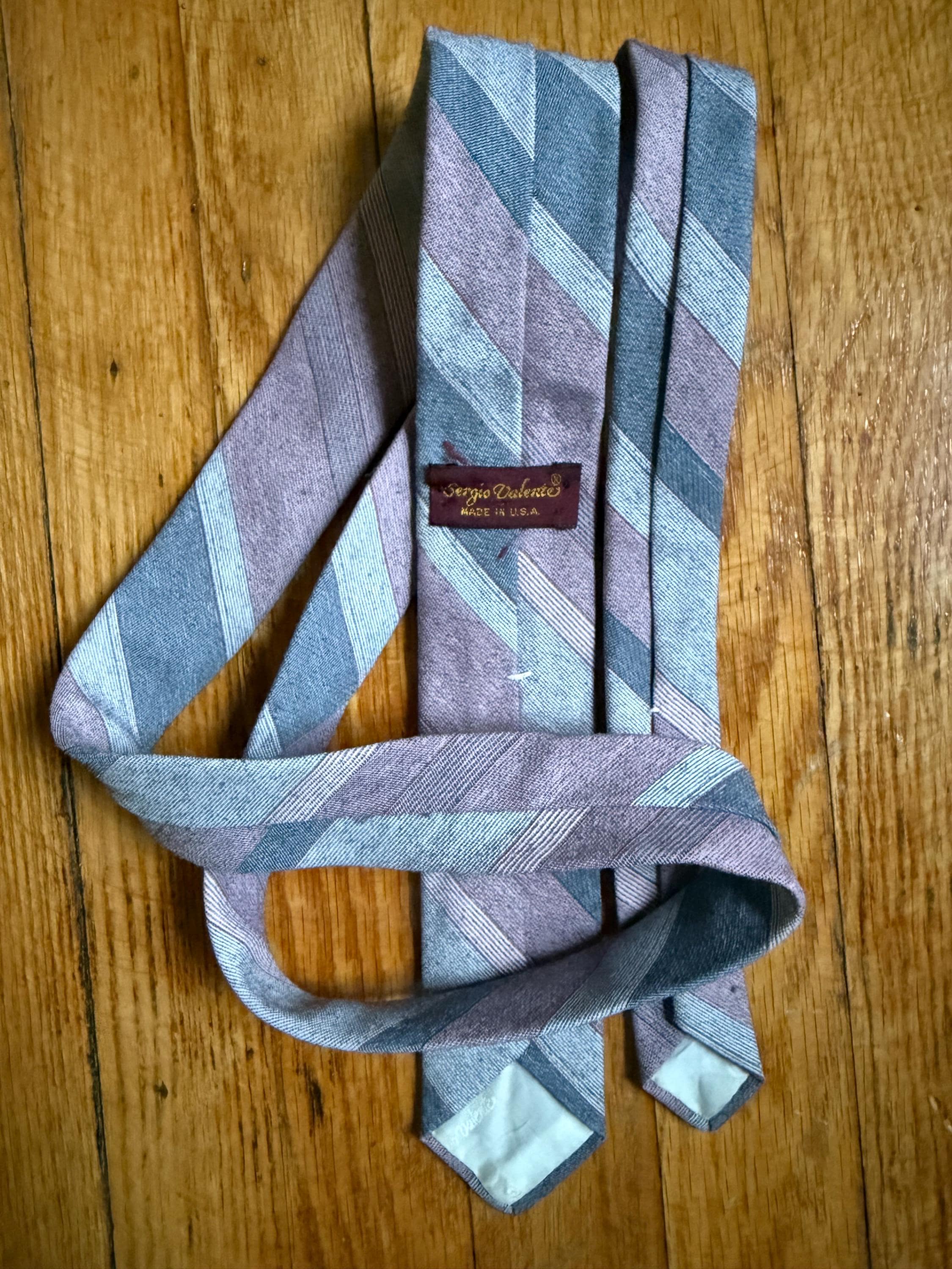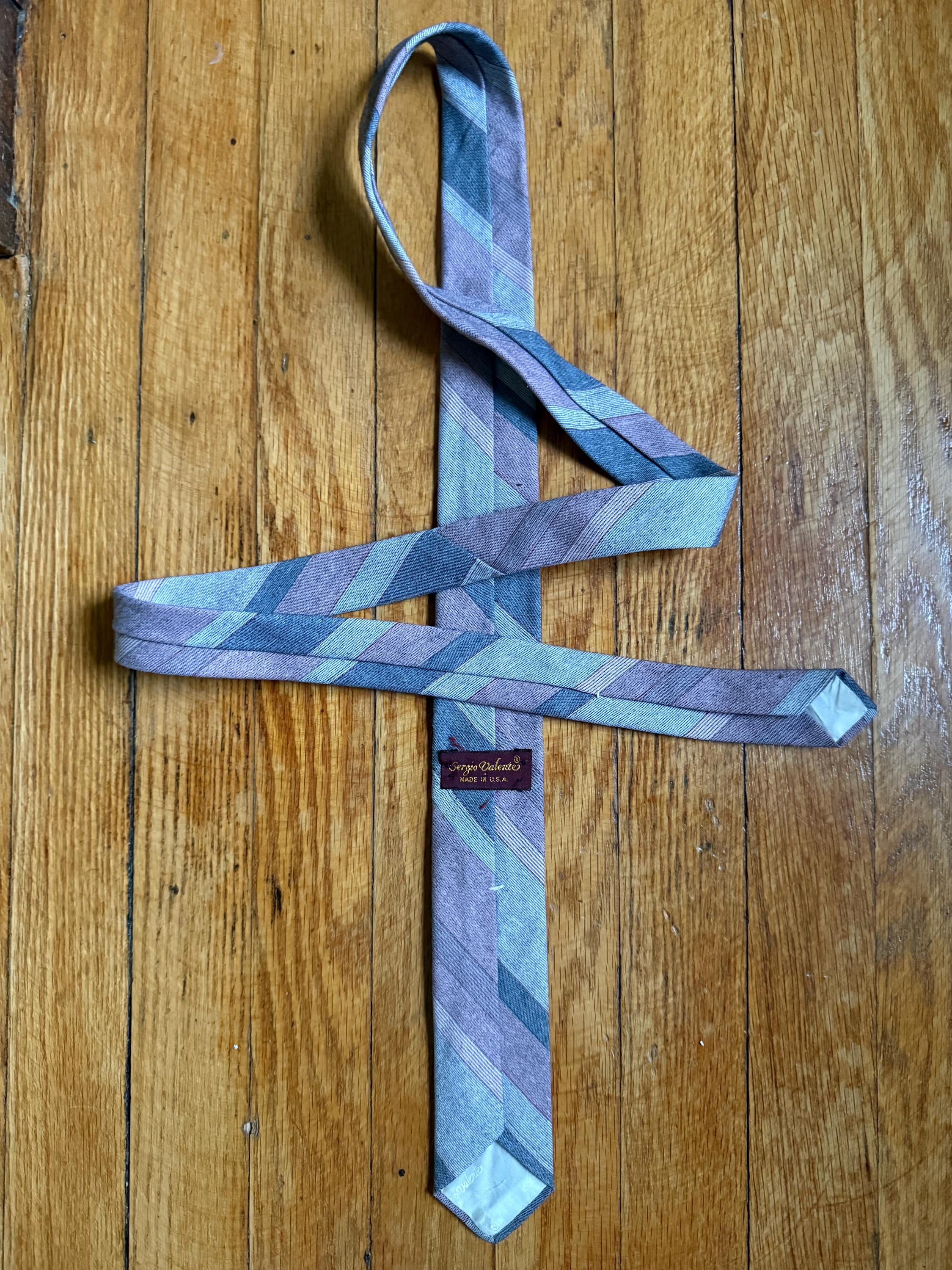 This necktie is 80s to the max: a Sergio Valente skinny tie, striped in pink and gray. It is in excellent vintage condition, probably because it was well loved cared for. The striped pattern is a yarn-dyed woven blend, probably poly/cotton. Very Anthony Michael Hall!