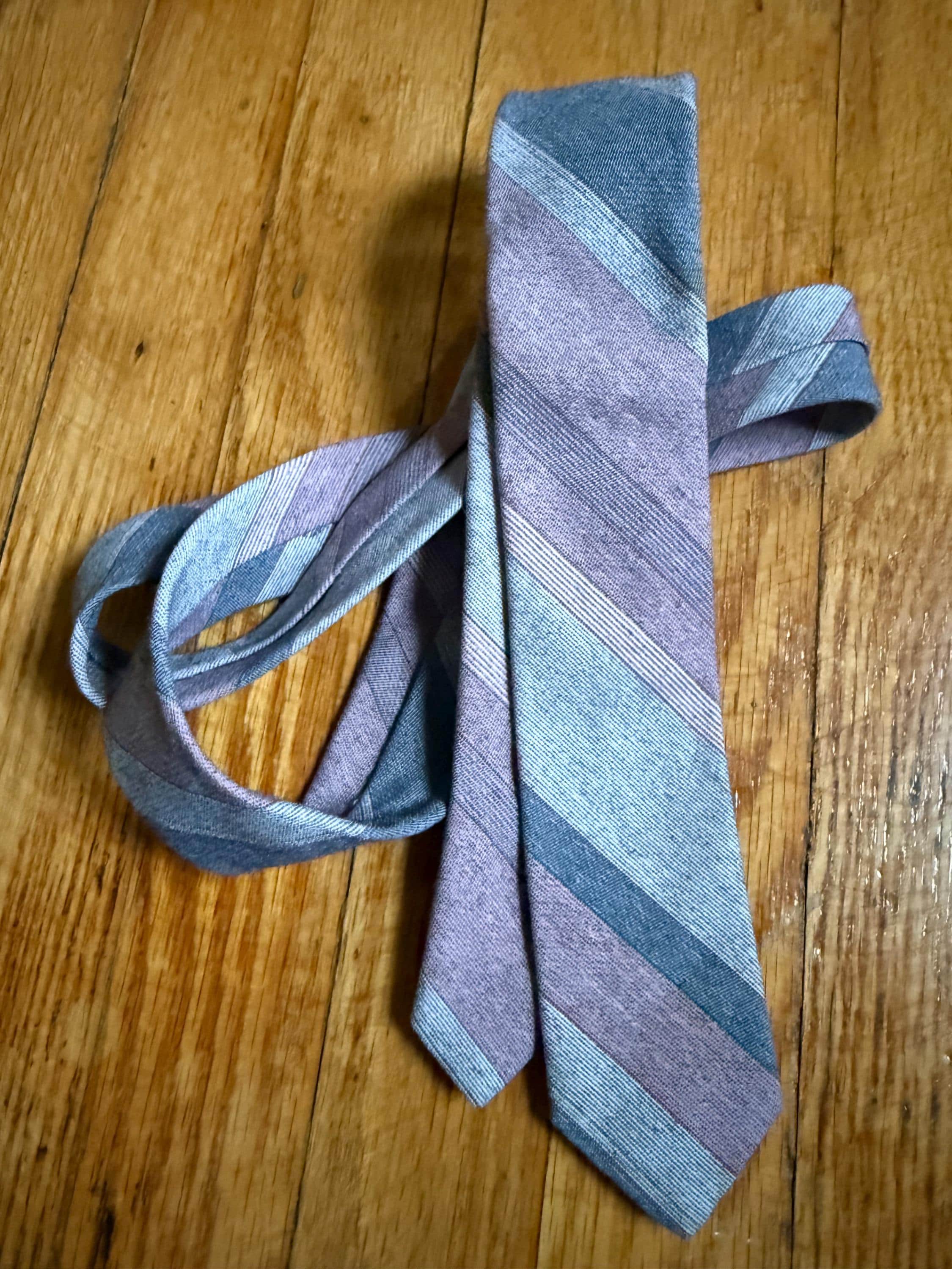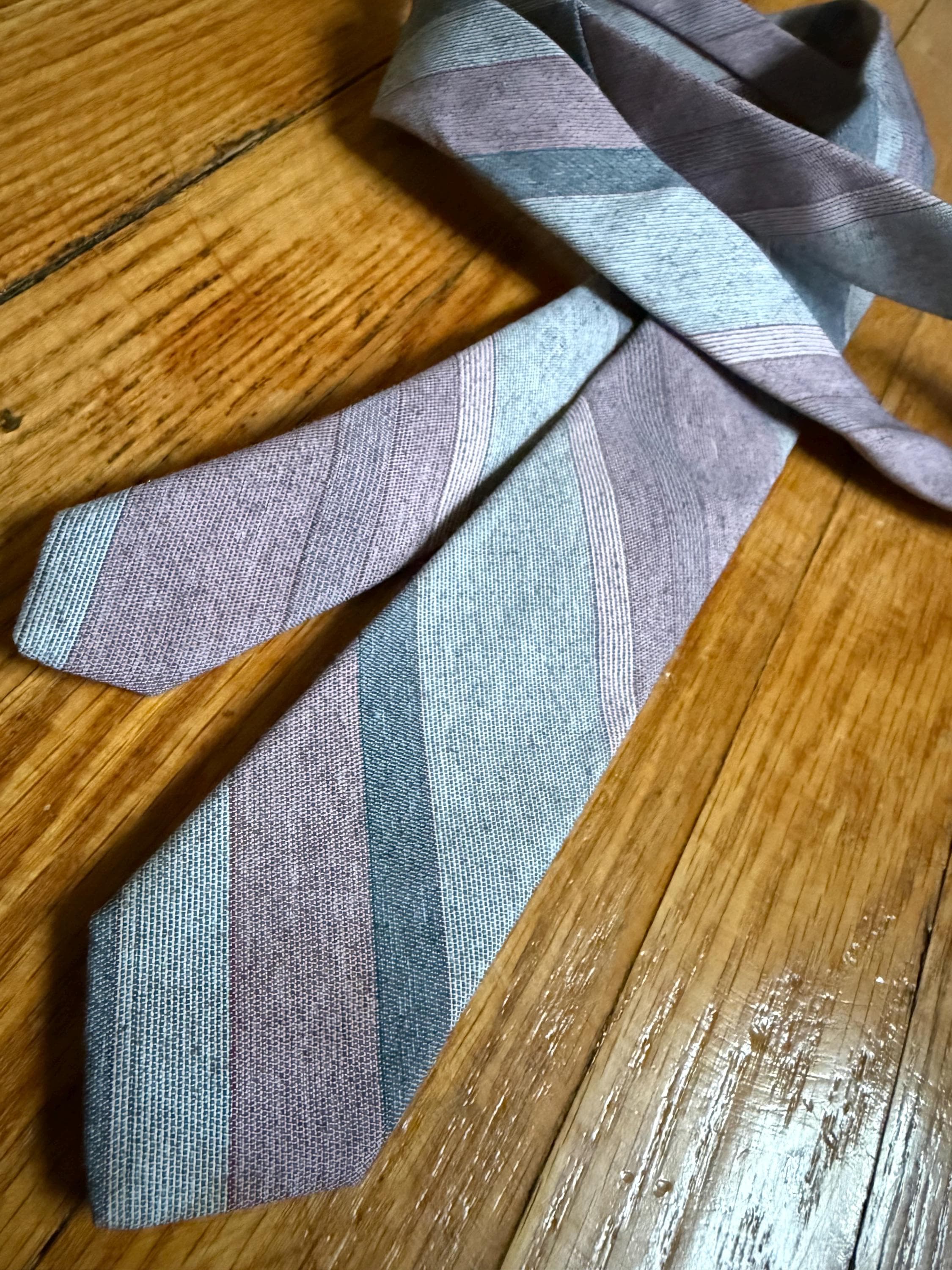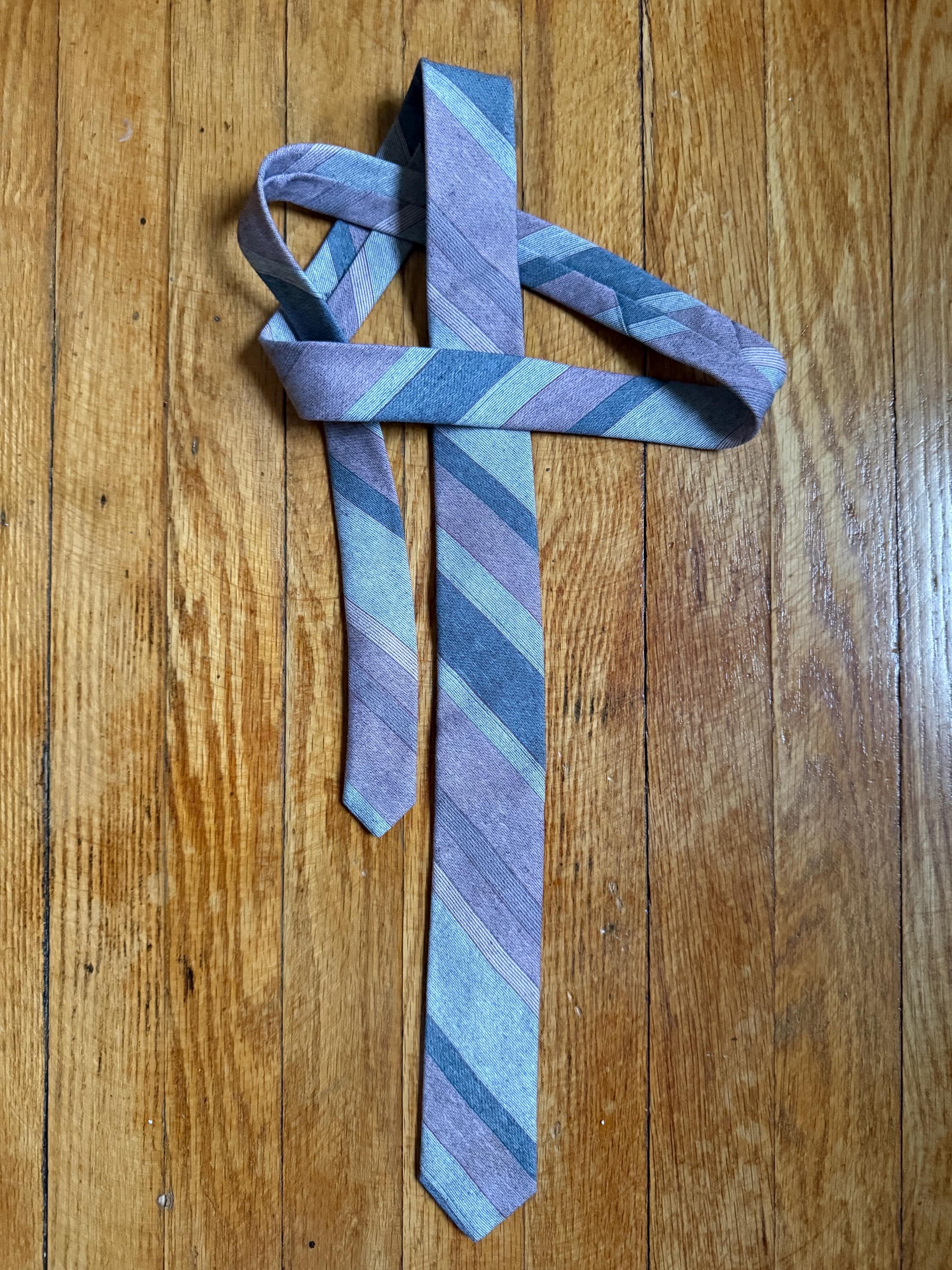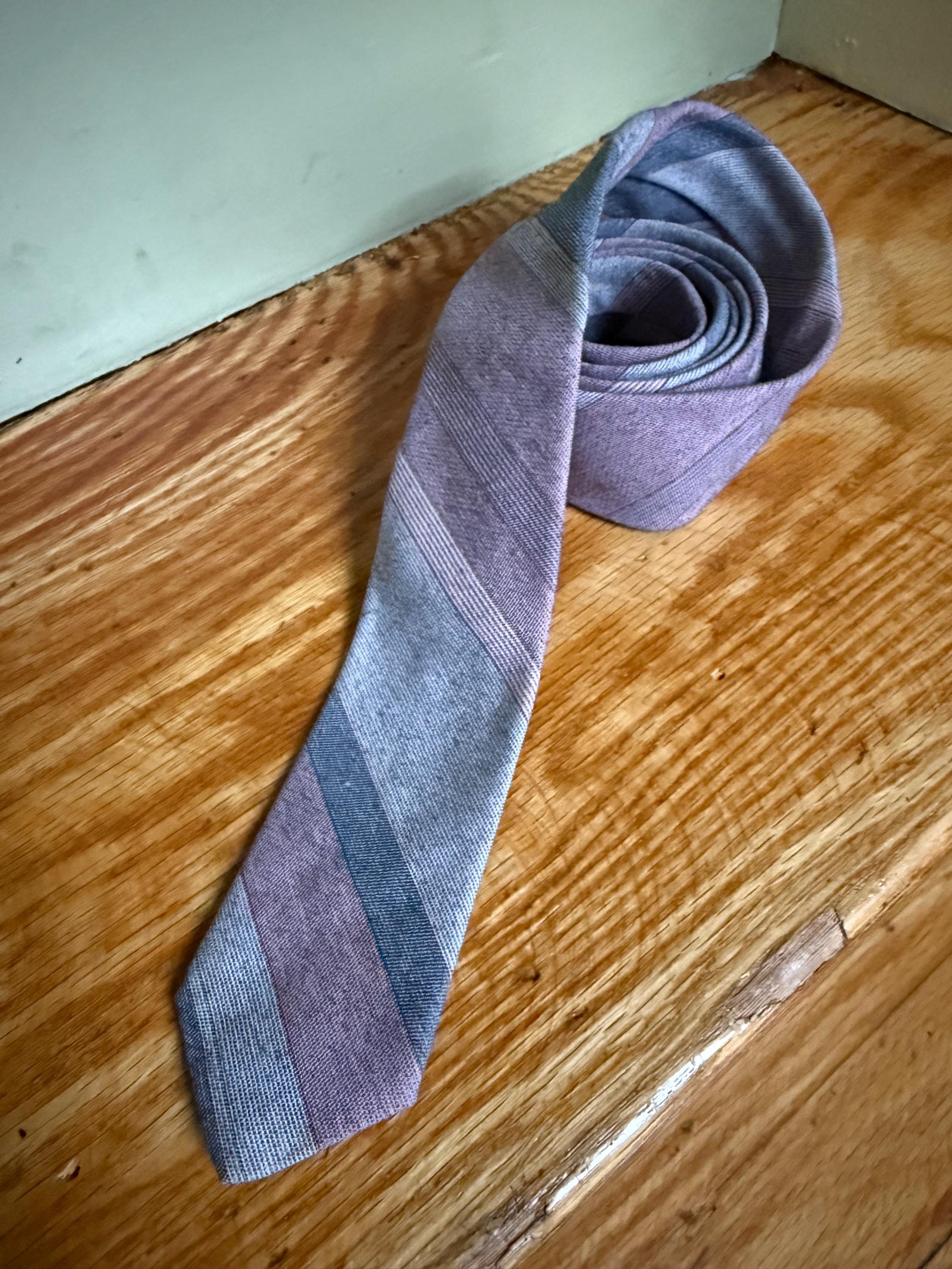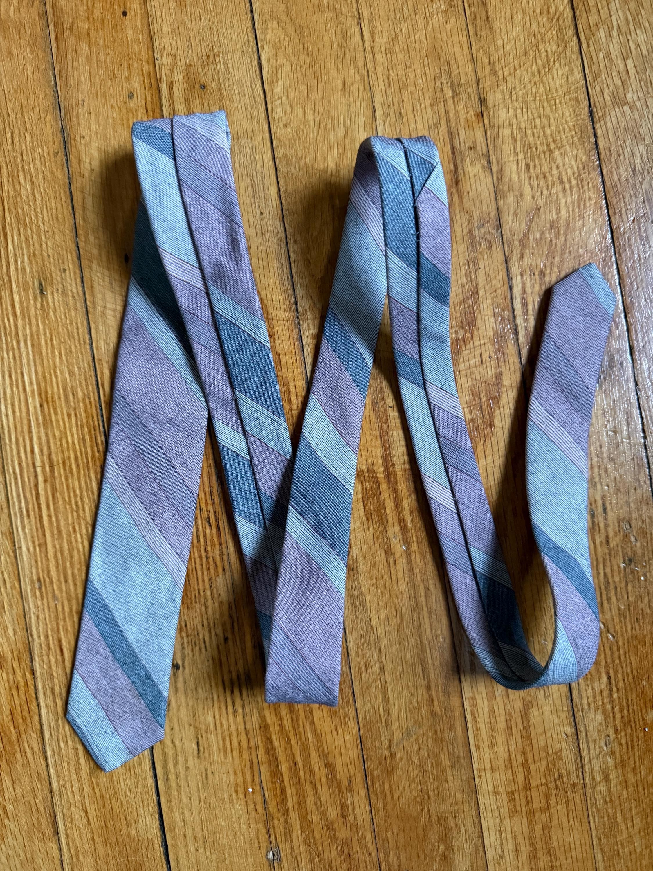 This necktie is 80s to the max: a Sergio Valente skinny tie, striped in pink and gray. It is in excellent vintage condition, probably because it was well loved cared for. The striped pattern is a yarn-dyed woven blend, probably poly/cotton. Very Anthony Michael Hall!