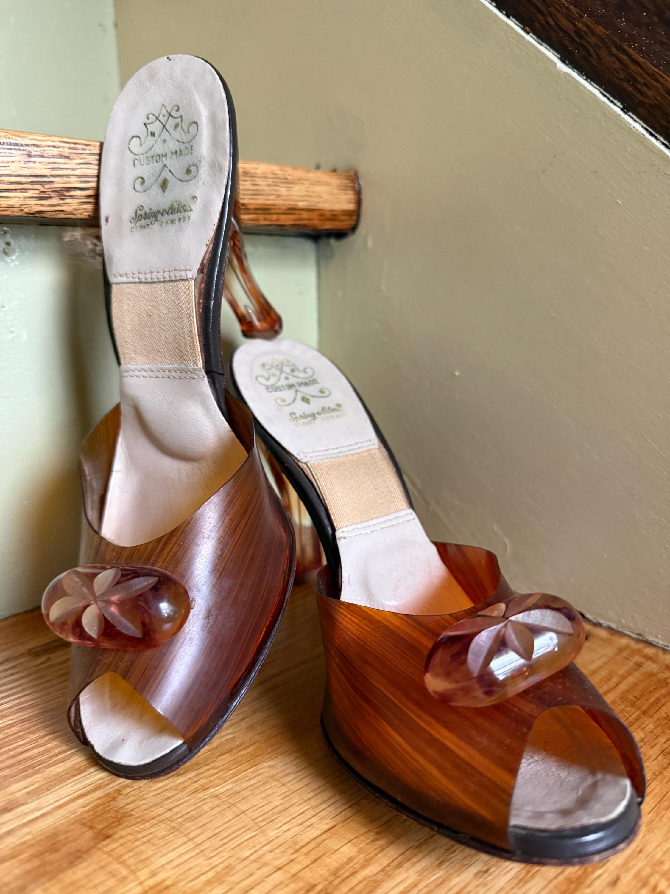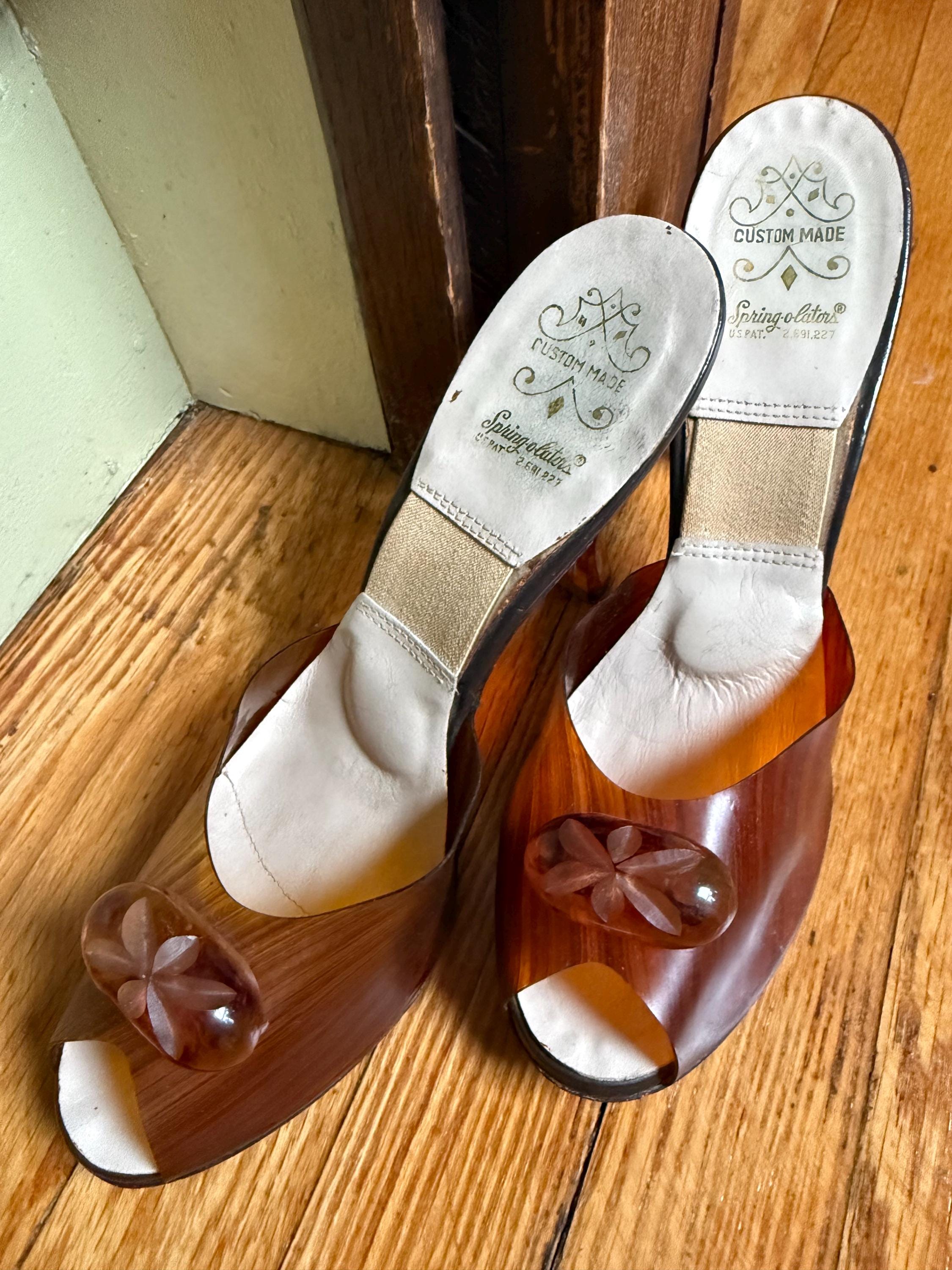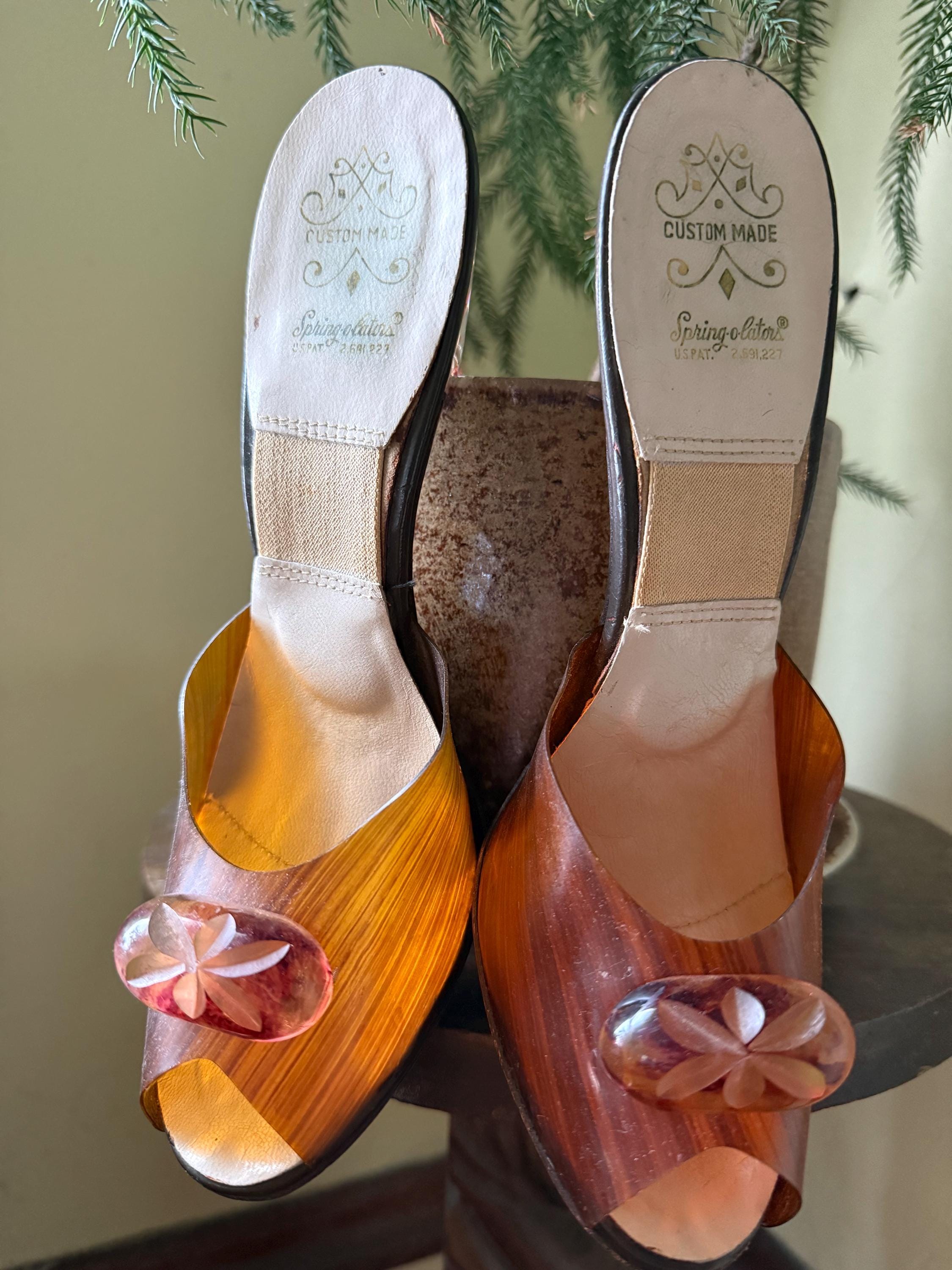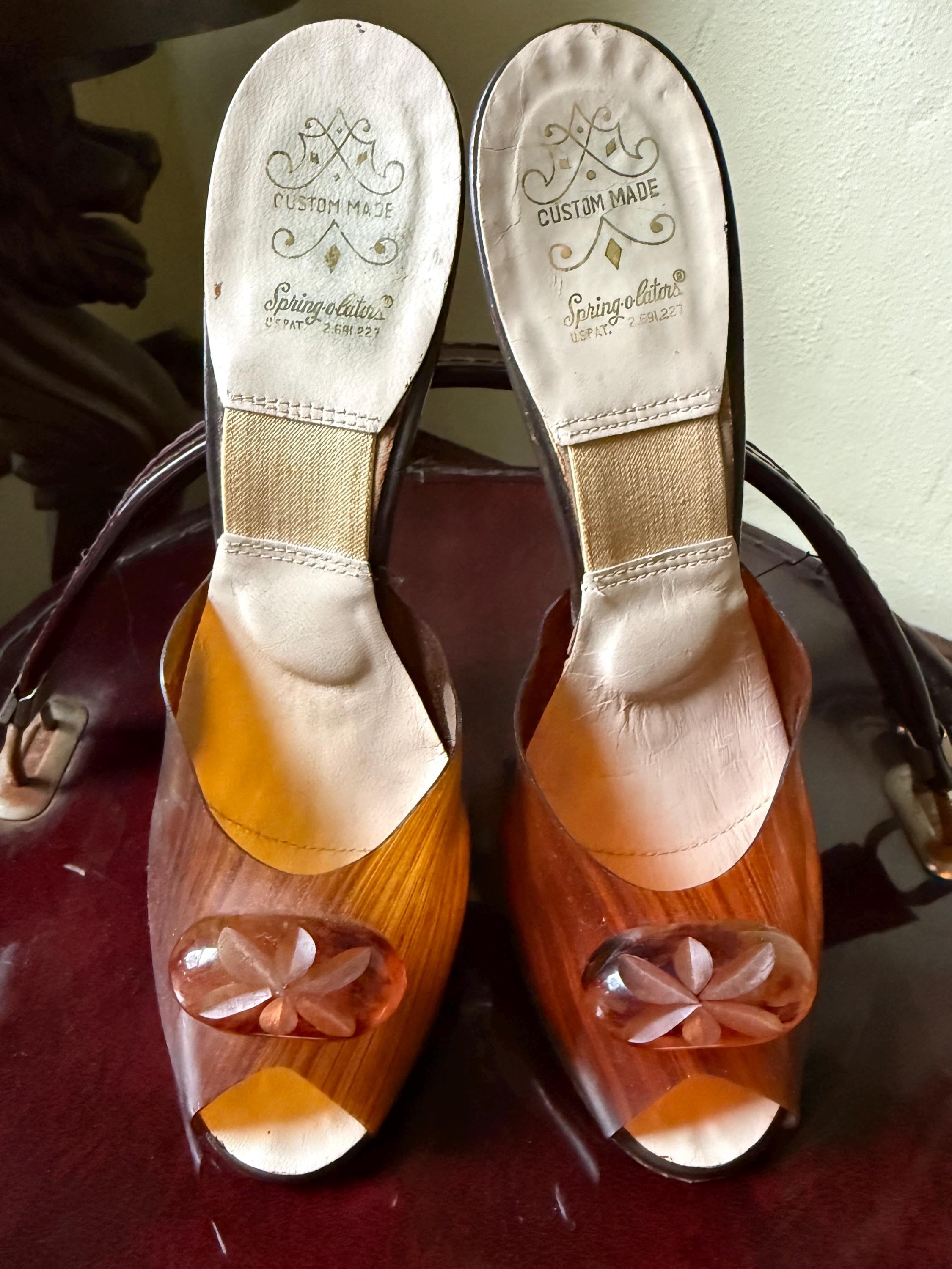 These shoes are just gorgeous! They are a pair of 1950s Spring-o-lators in excellent vintage condition. The translucent peeptoe box reminds me of wood grain. The 4” lucite heels have wheat spears carved into them, while the oval shaped lucite medallions on the toes display a floral motif. The elastic inserted into the insoles is in perfect condition and will keep these mules snug on your feet in the absence of heels straps. The soles and heel tips are leather and barely worn. There is no size marked on them, but they measure to be a women’s size 7 ( the insoles measure 9.5” from toe to heel), but because of their narrow width, they might be better suited for a 6-6.5 sized foot.