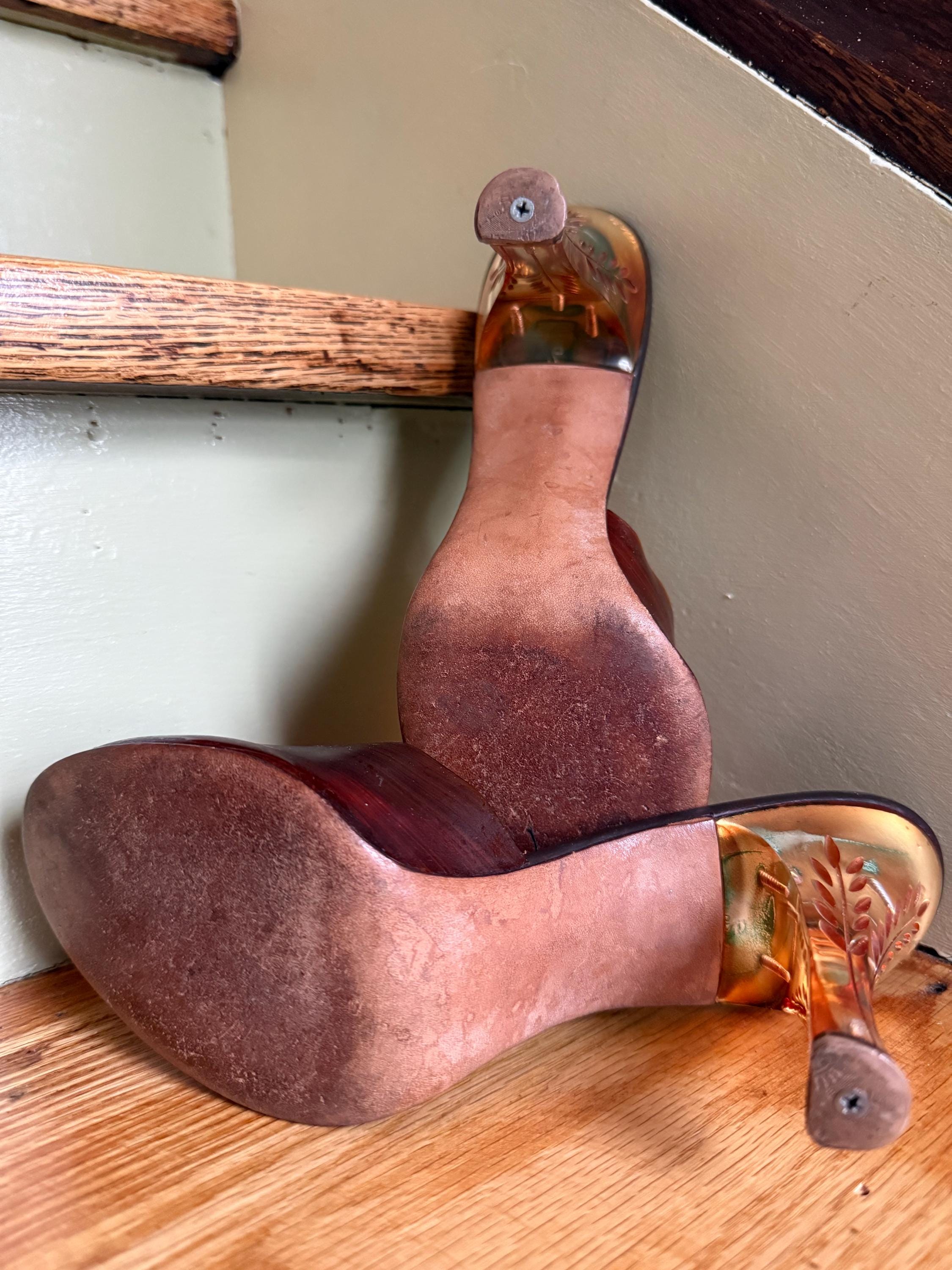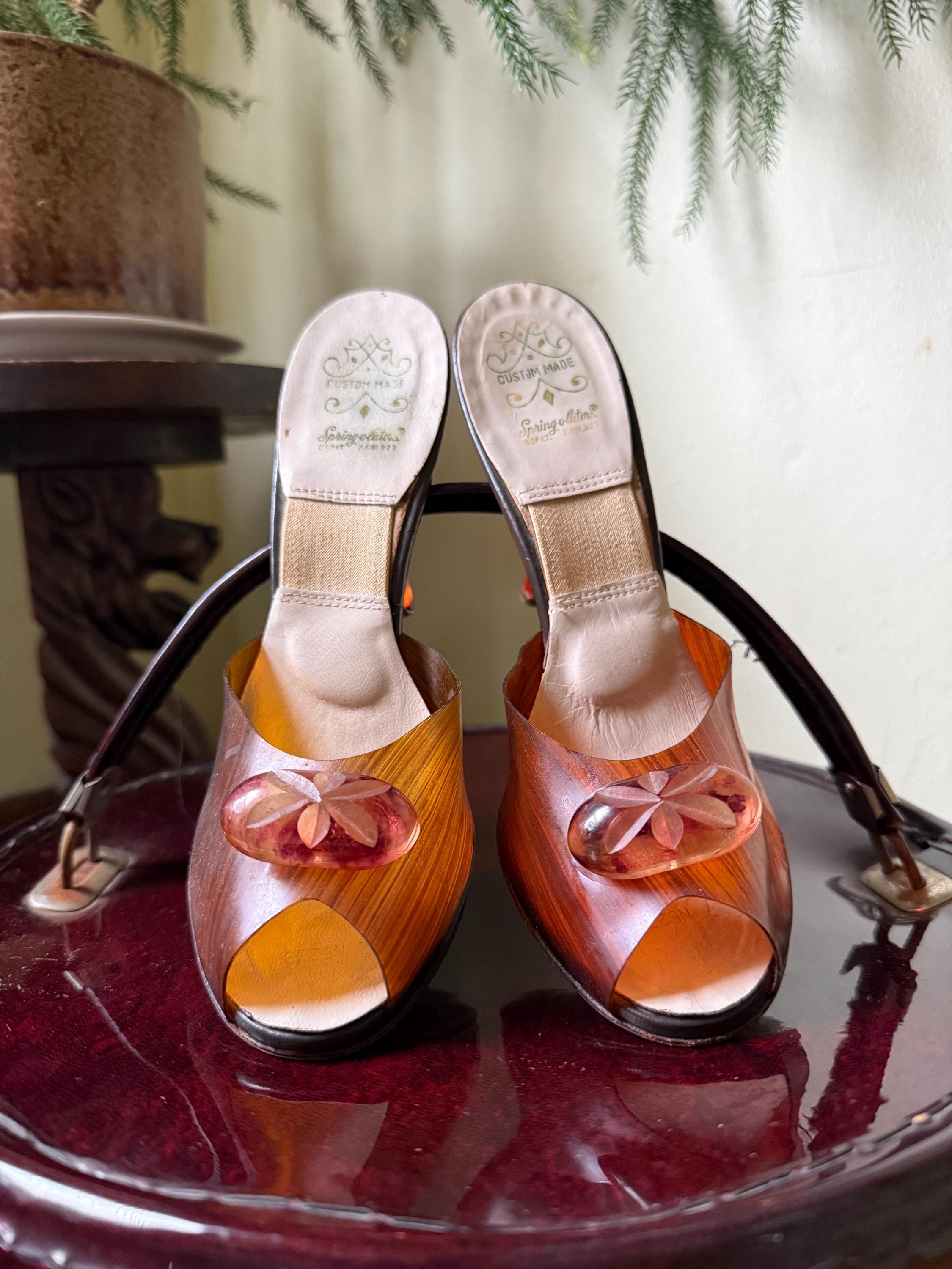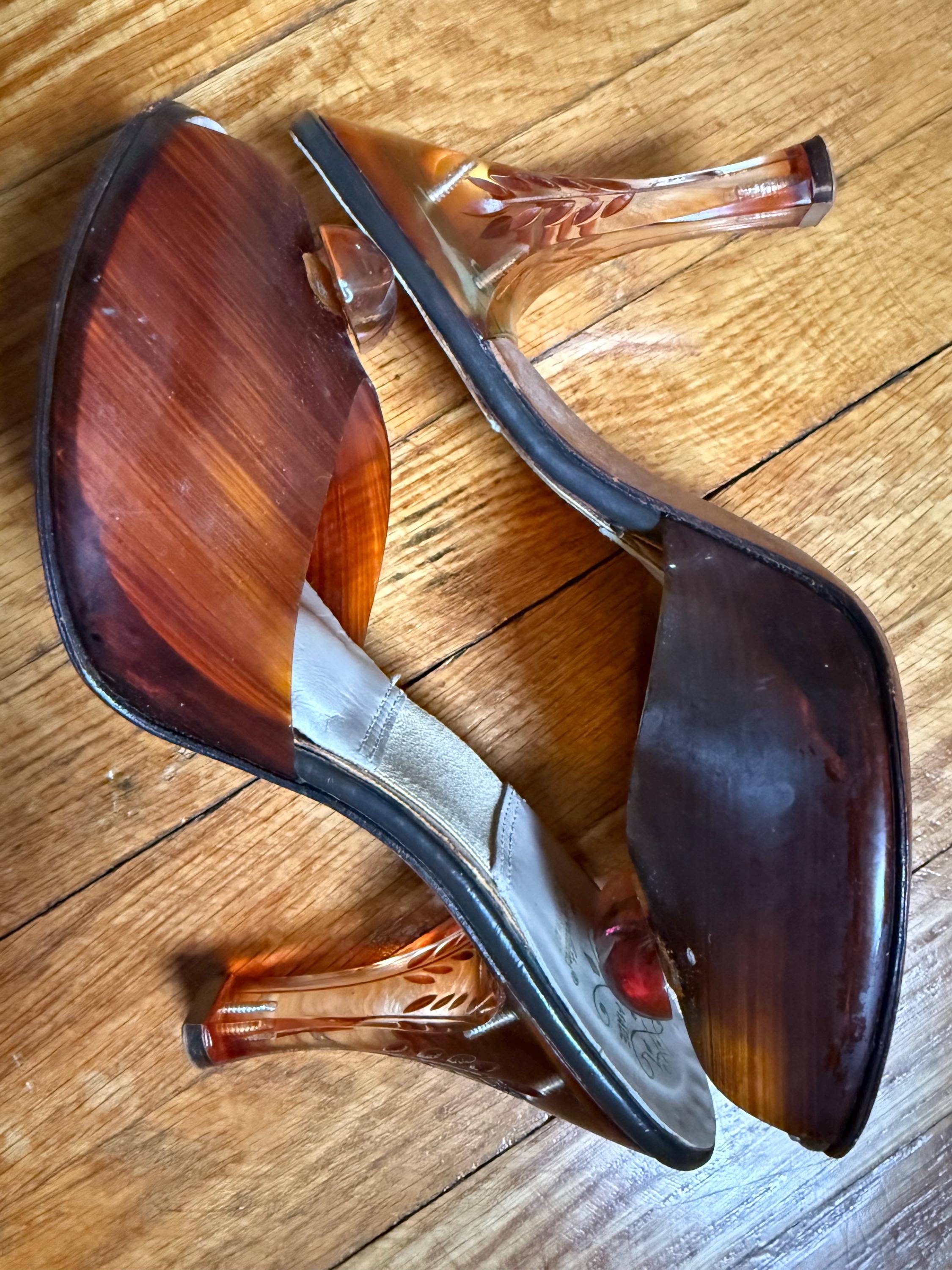 These shoes are just gorgeous! They are a pair of 1950s Spring-o-lators in excellent vintage condition. The translucent peeptoe box reminds me of wood grain. The 4” lucite heels have wheat spears carved into them, while the oval shaped lucite medallions on the toes display a floral motif. The elastic inserted into the insoles is in perfect condition and will keep these mules snug on your feet in the absence of heels straps. The soles and heel tips are leather and barely worn. There is no size marked on them, but they measure to be a women’s size 7 ( the insoles measure 9.5” from toe to heel), but because of their narrow width, they might be better suited for a 6-6.5 sized foot.