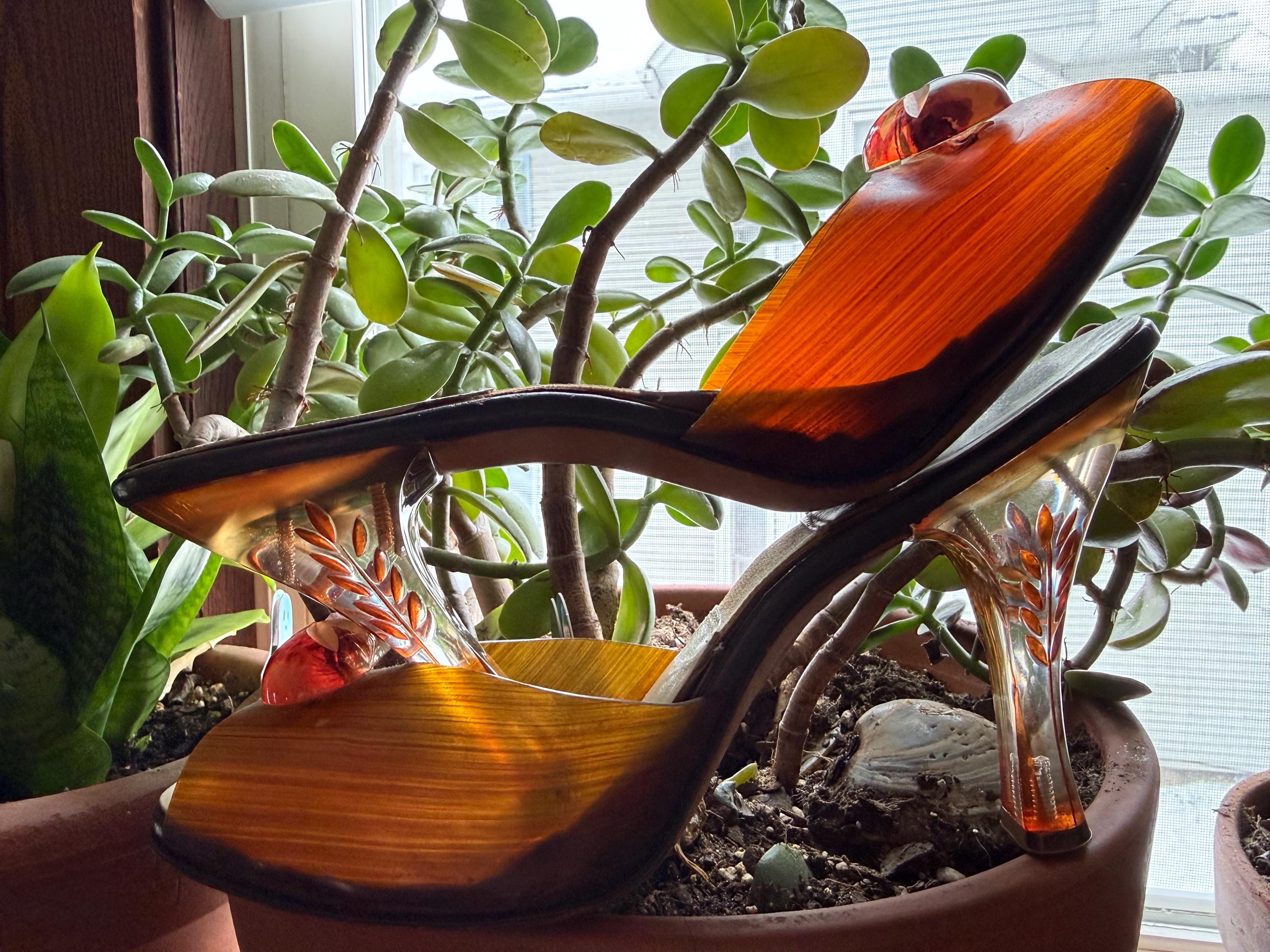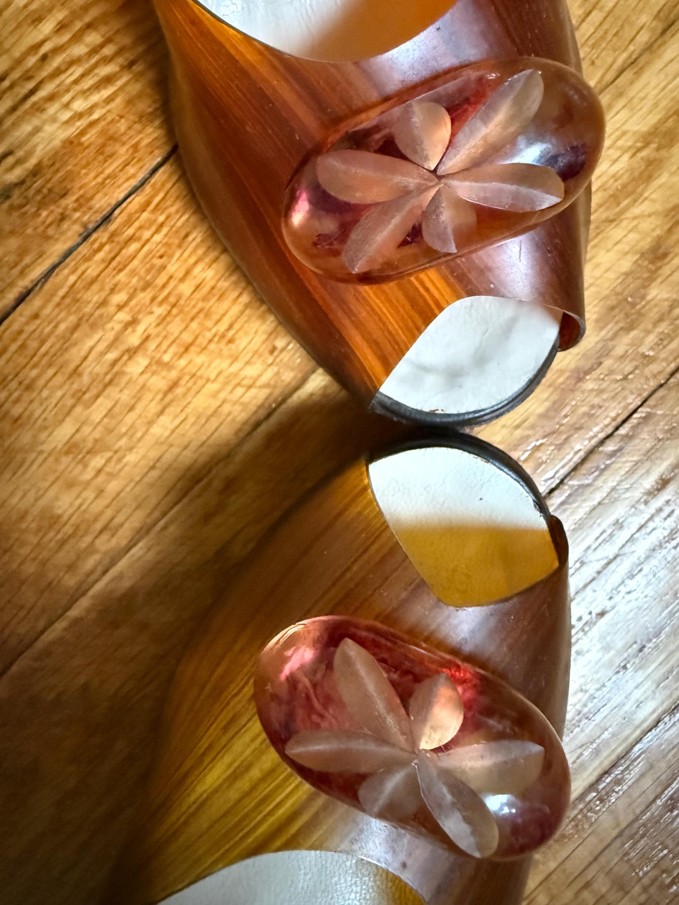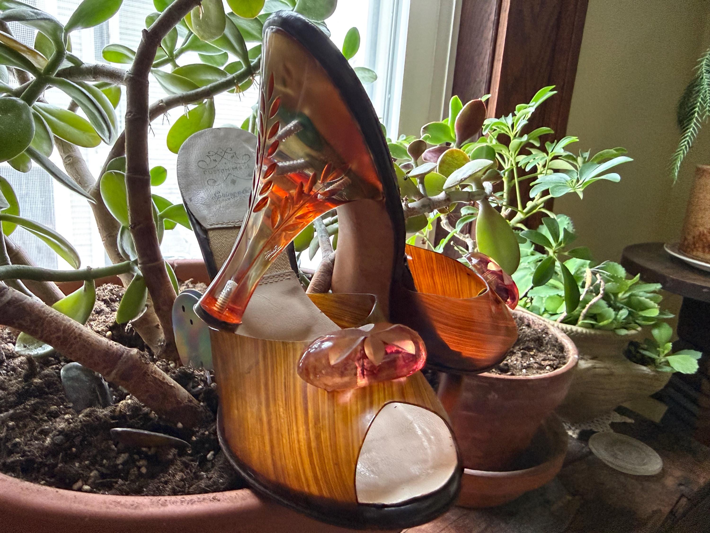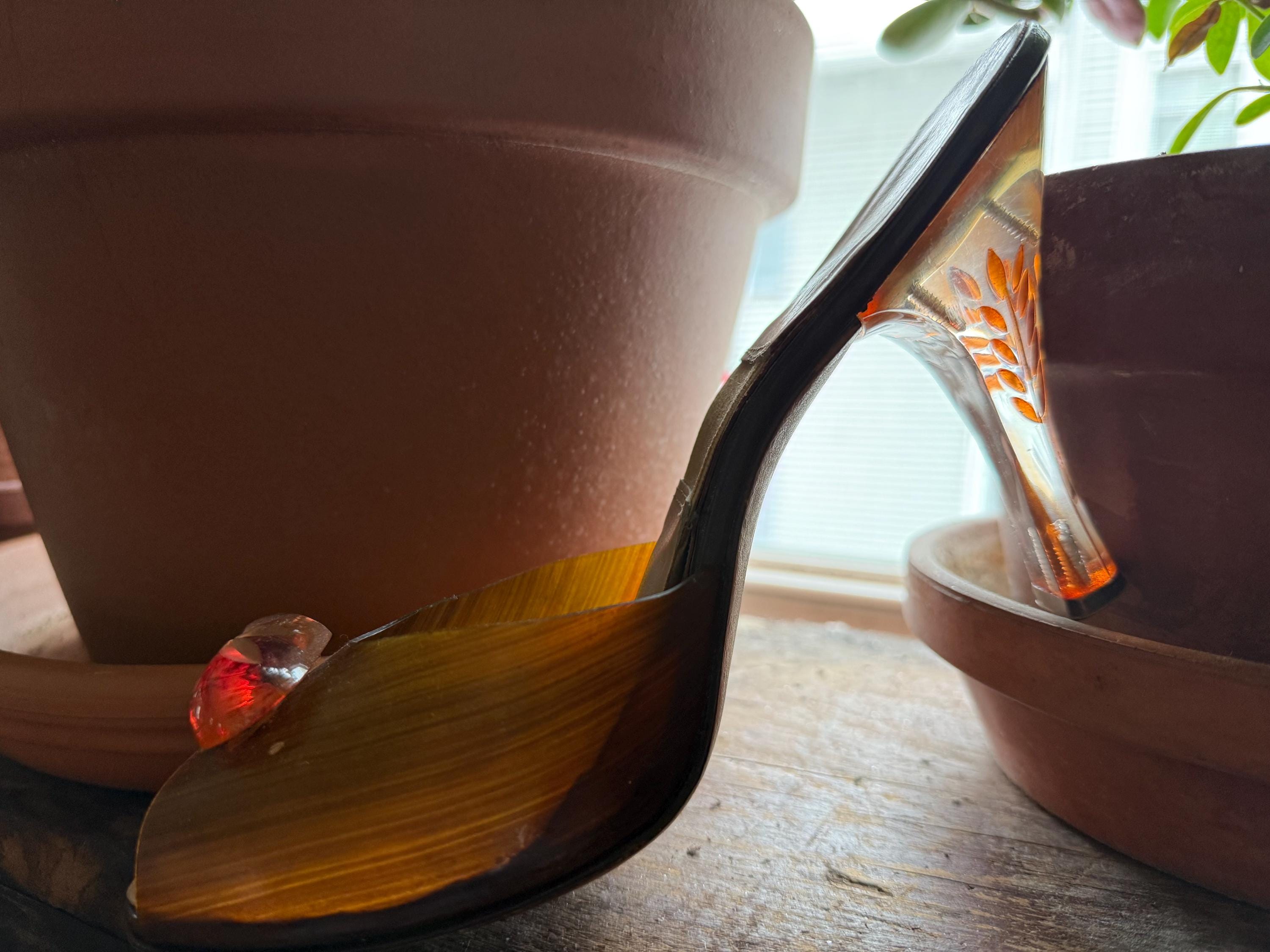 These shoes are just gorgeous! They are a pair of 1950s Spring-o-lators in excellent vintage condition. The translucent peeptoe box reminds me of wood grain. The 4” lucite heels have wheat spears carved into them, while the oval shaped lucite medallions on the toes display a floral motif. The elastic inserted into the insoles is in perfect condition and will keep these mules snug on your feet in the absence of heels straps. The soles and heel tips are leather and barely worn. There is no size marked on them, but they measure to be a women’s size 7 ( the insoles measure 9.5” from toe to heel), but because of their narrow width, they might be better suited for a 6-6.5 sized foot.