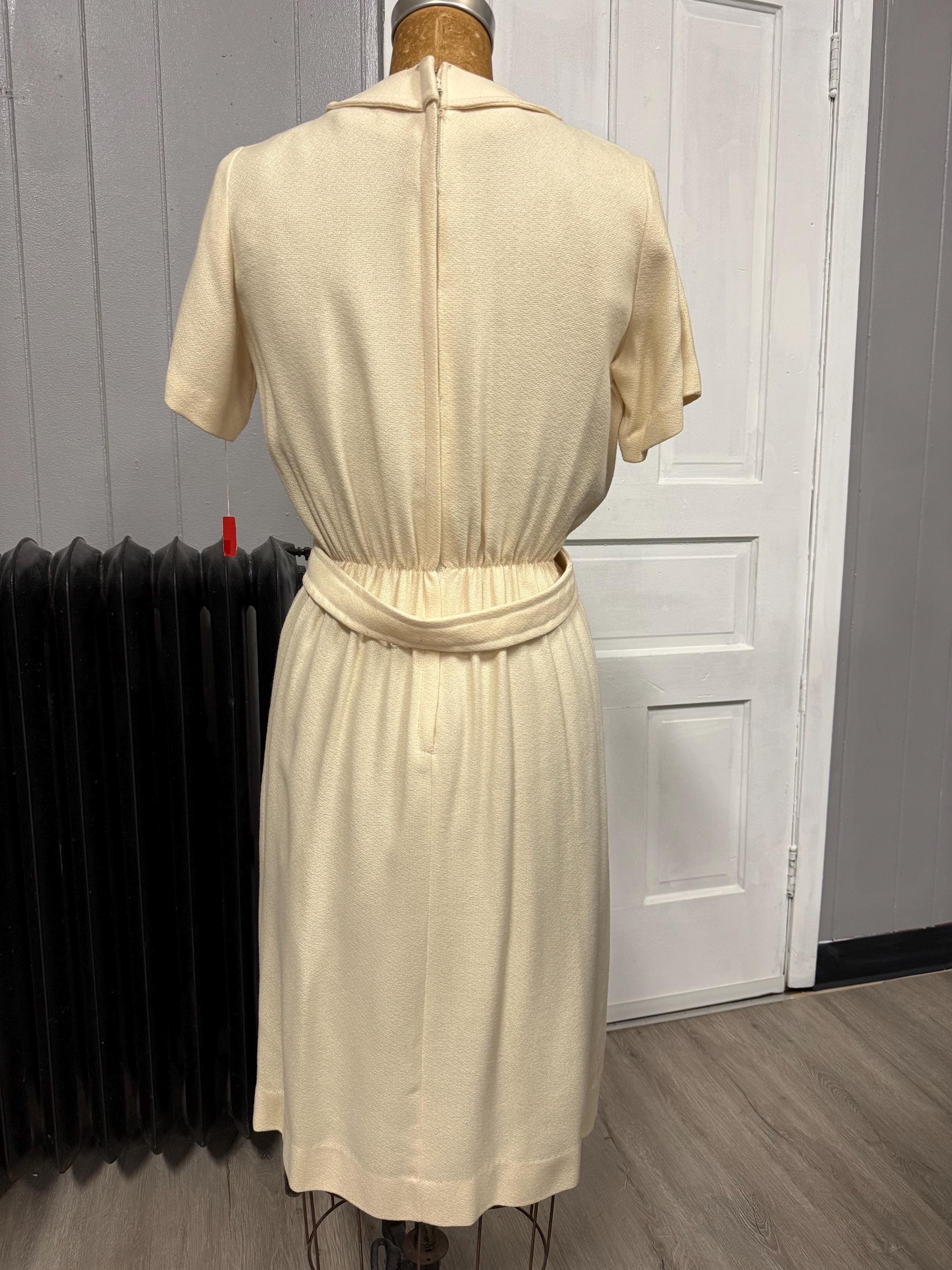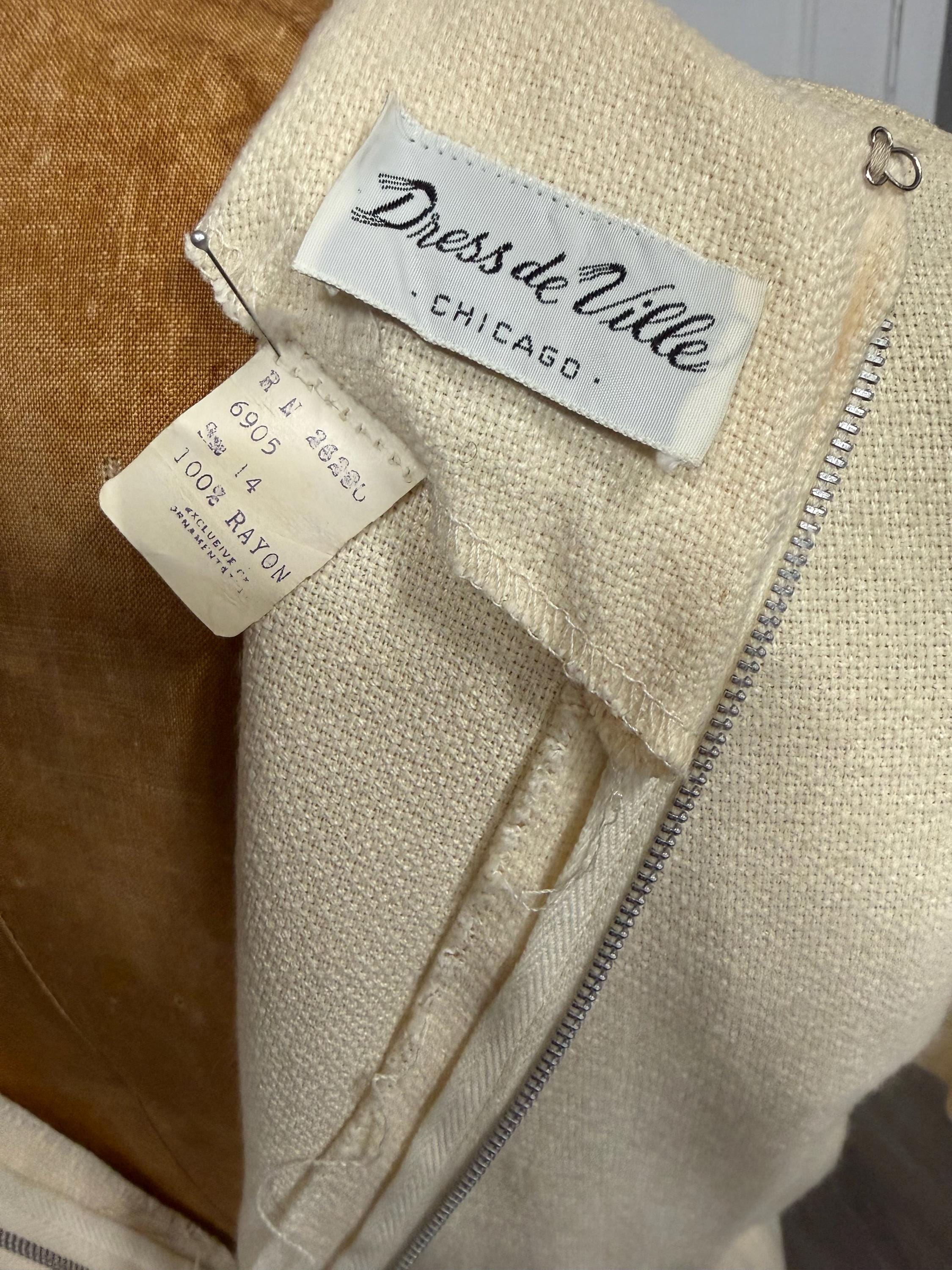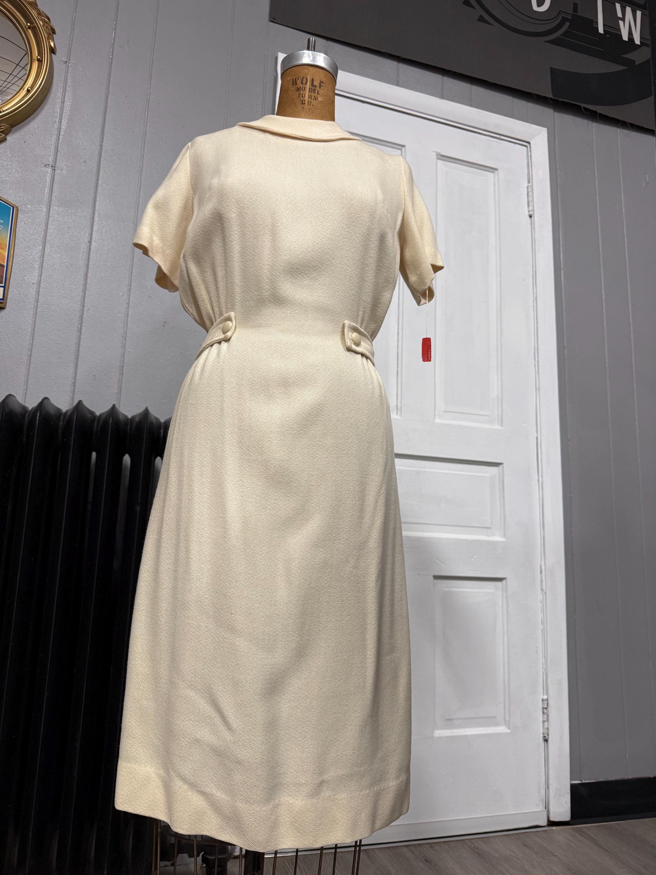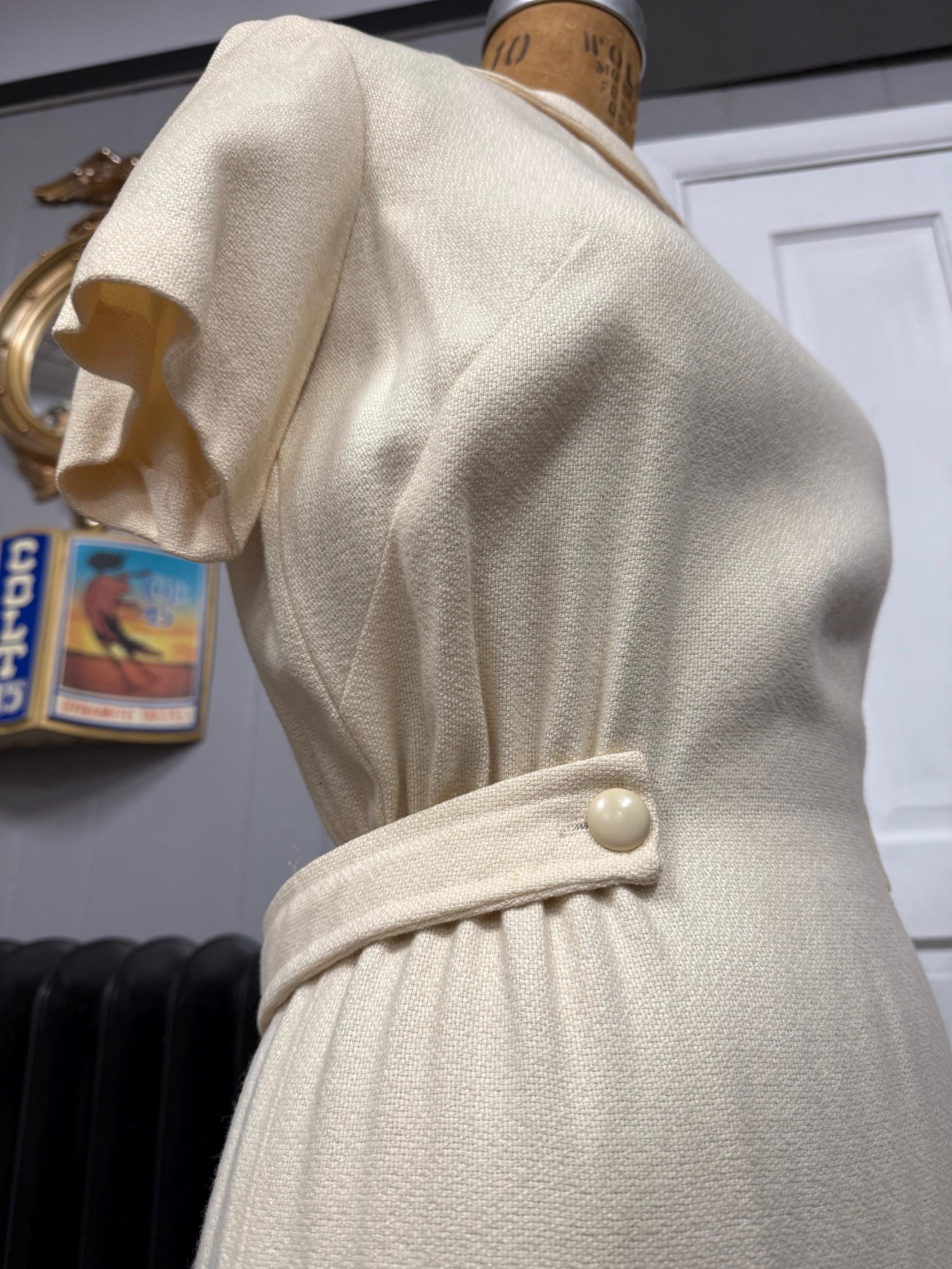 This is a lovely winter white, woven rayon dress from the late 50s, early 60s. I love a monochromatic look like this, with a sweet, belted waist, accented by matching buttons. The collar is a stitched-down detail and the dress is unlined. It is in perfect vintage condition, as it it deadstock and has been well stored. The tag is marked as a size 16, which would fit a modern size 10-12. Please see measurements below. This dress could easily be dressed down for daytime office wear, or paired with some colorful accessories and elevated for a glamorous night out.