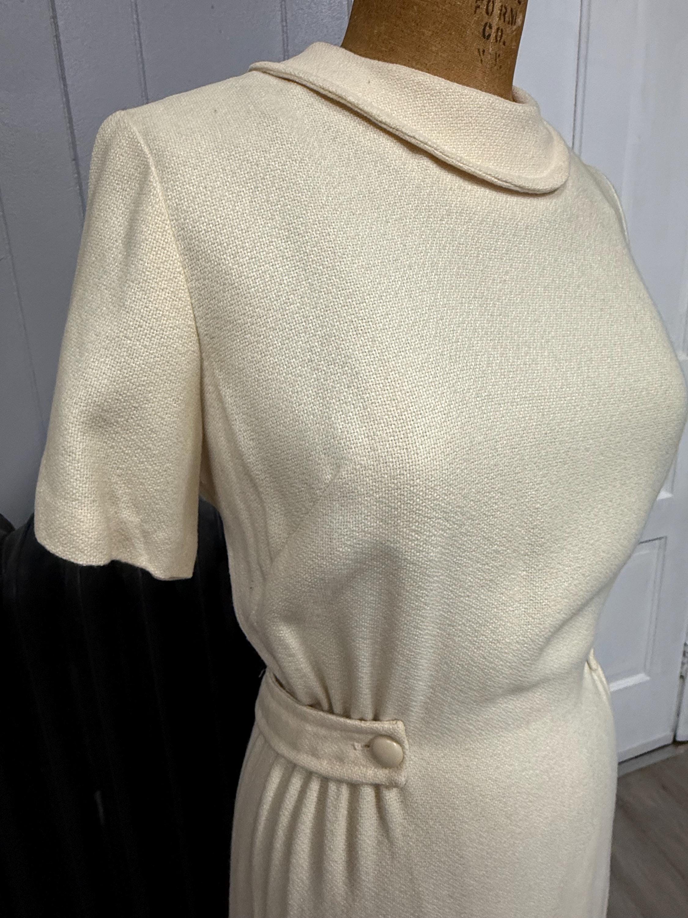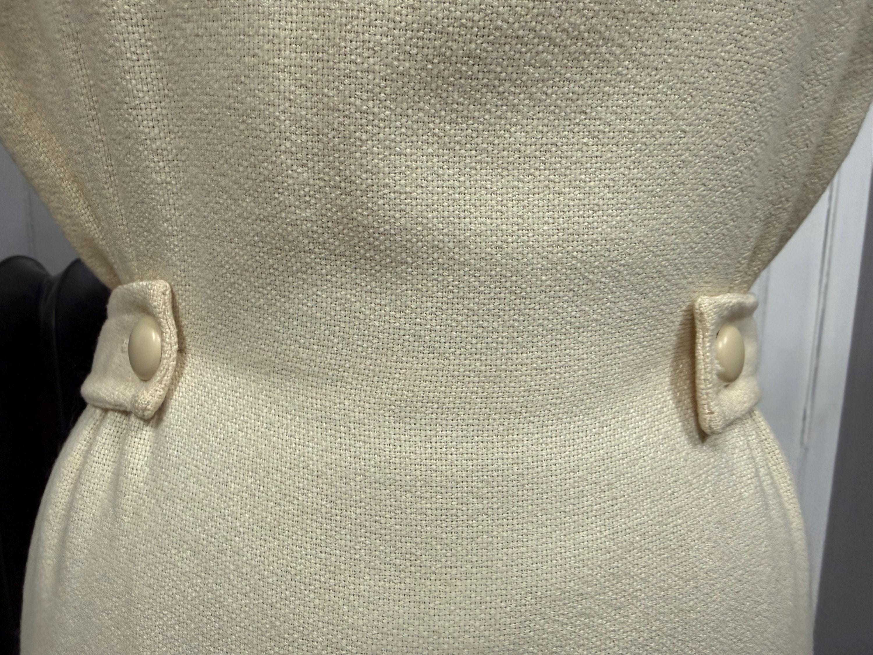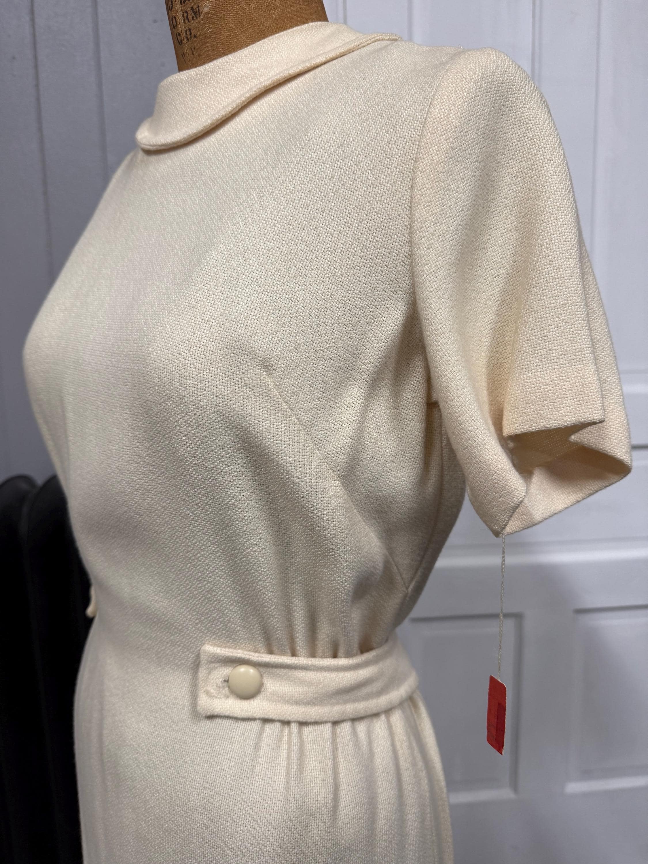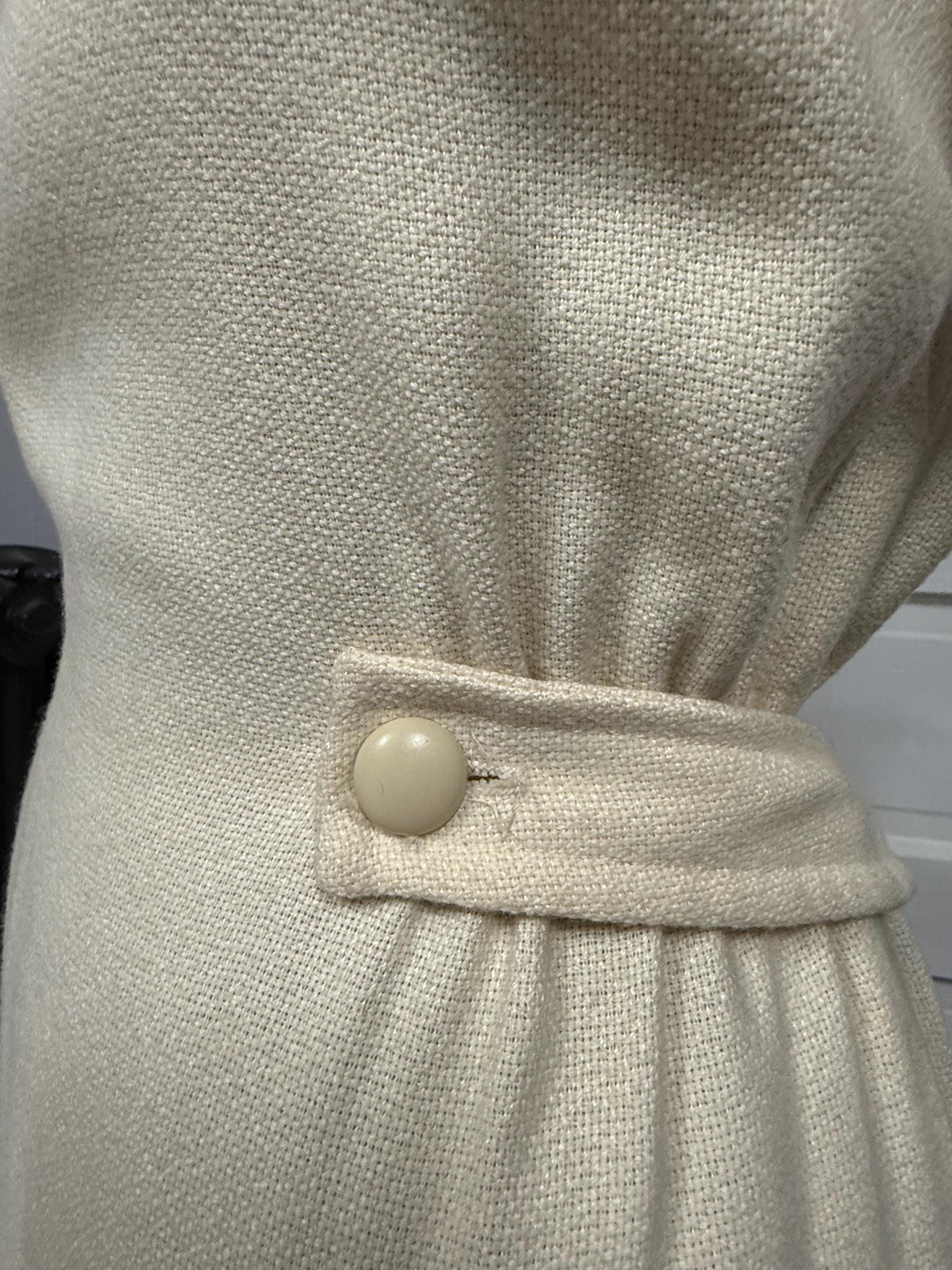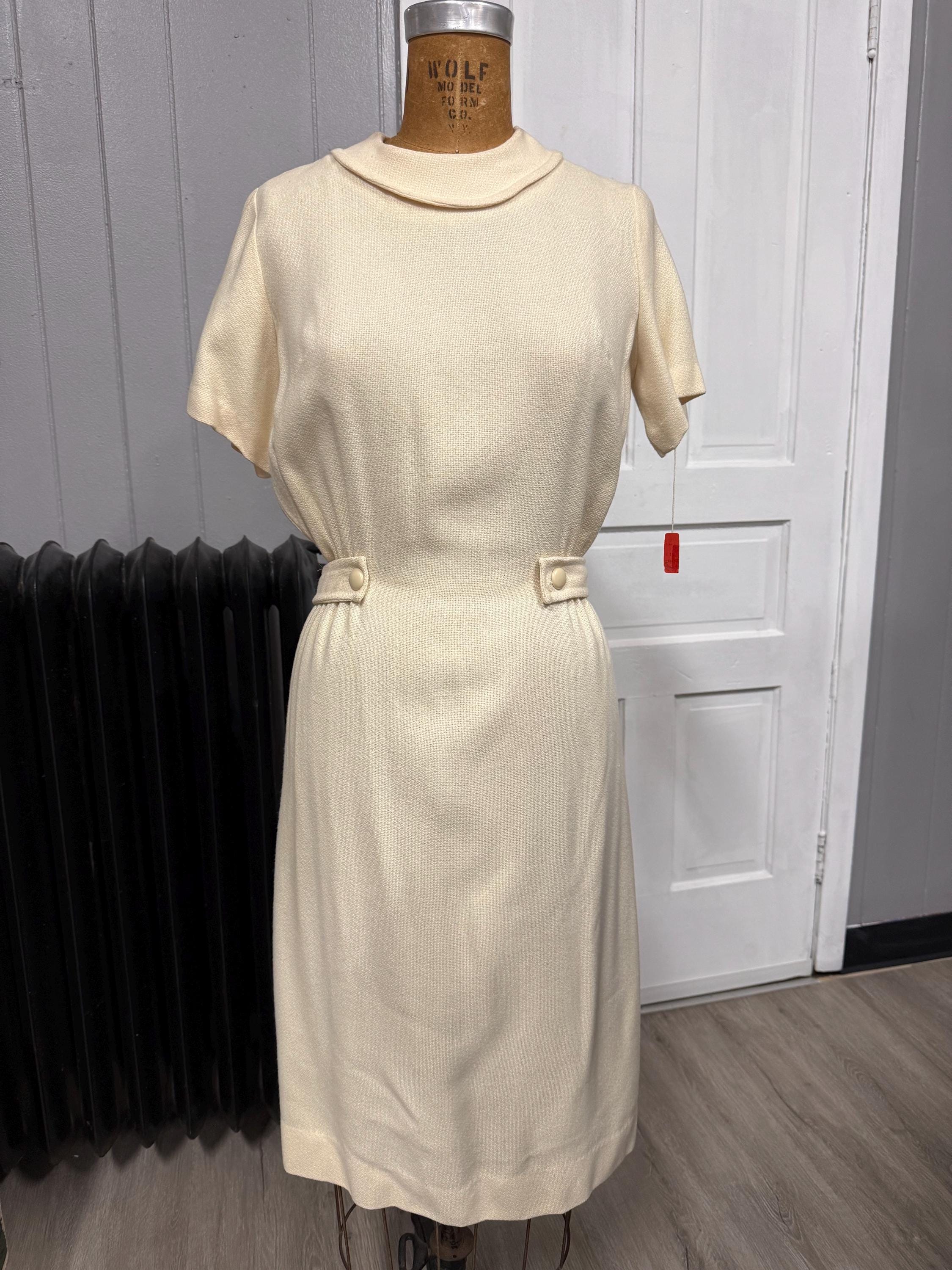This is a lovely winter white, woven rayon dress from the late 50s, early 60s. I love a monochromatic look like this, with a sweet, belted waist, accented by matching buttons. The collar is a stitched-down detail and the dress is unlined. It is in perfect vintage condition, as it it deadstock and has been well stored. The tag is marked as a size 16, which would fit a modern size 10-12. Please see measurements below. This dress could easily be dressed down for daytime office wear, or paired with some colorful accessories and elevated for a glamorous night out.