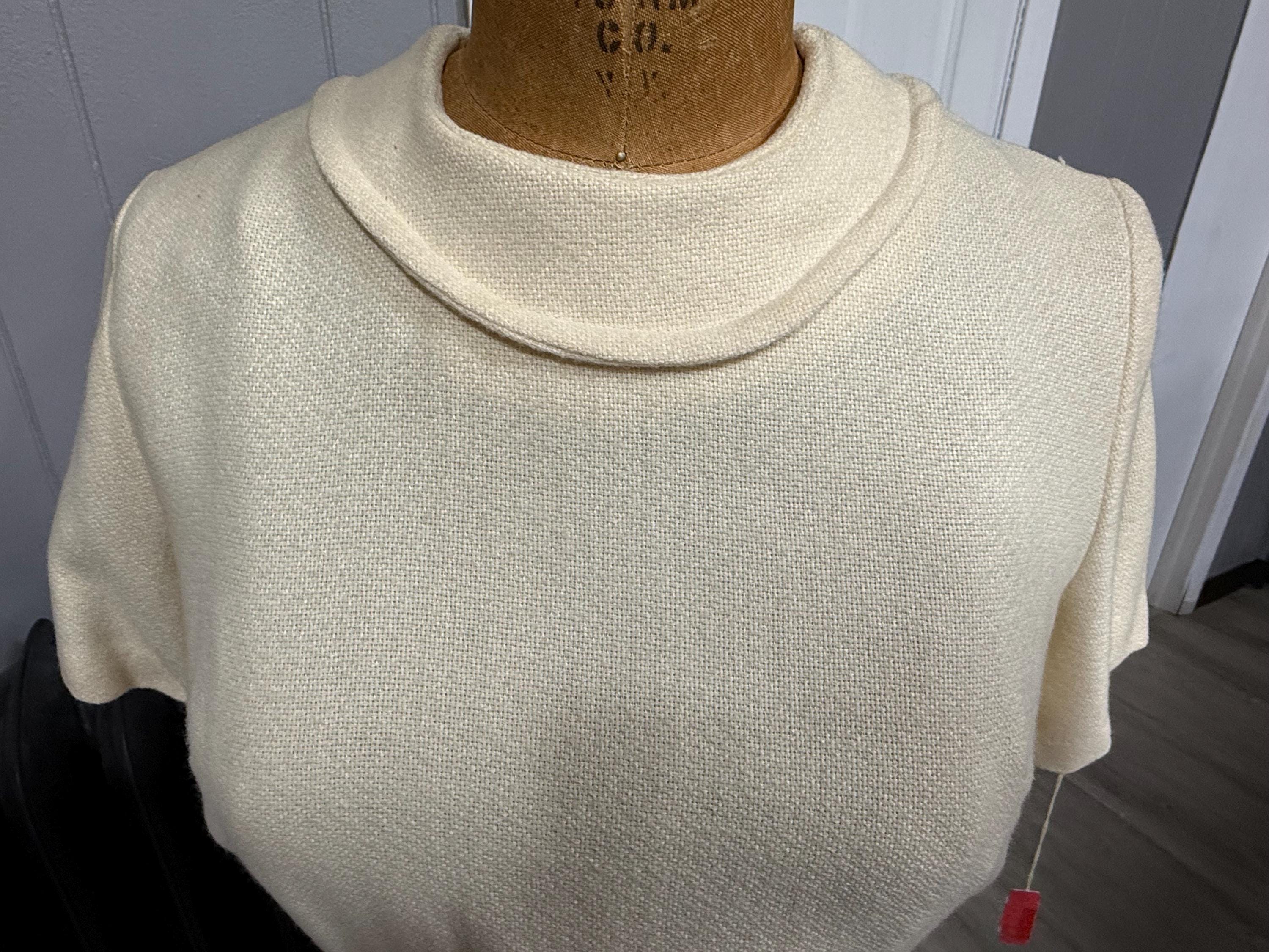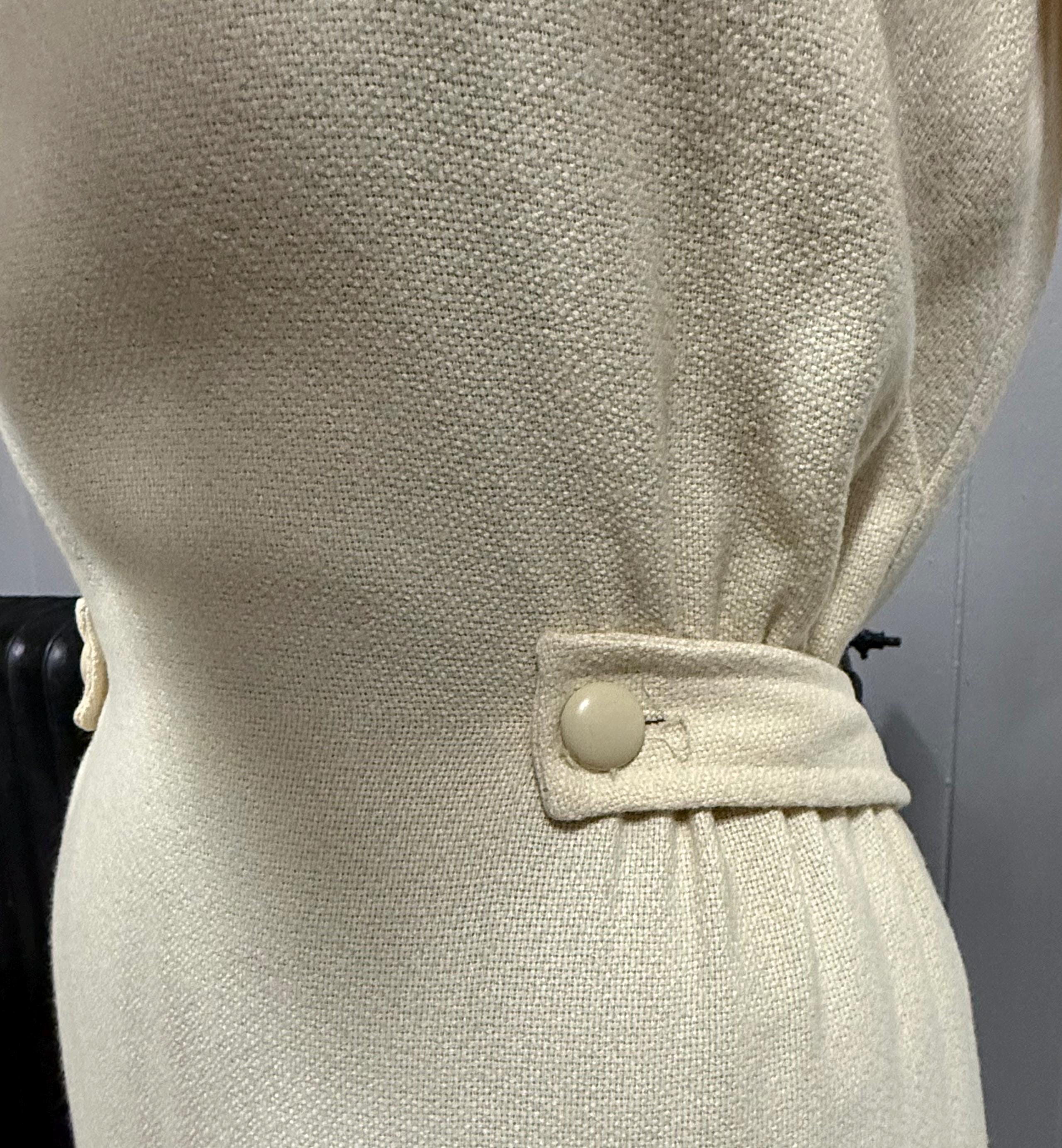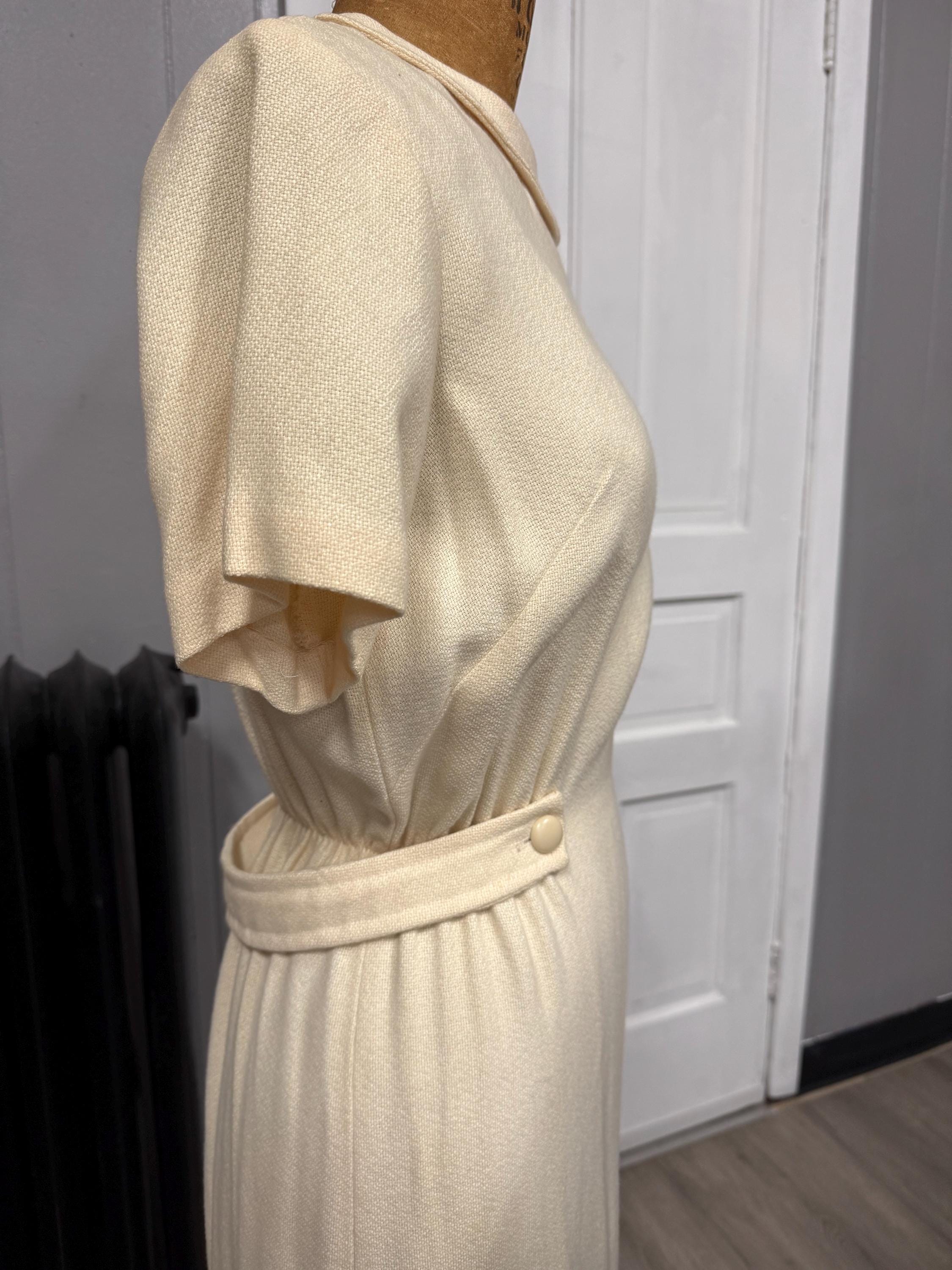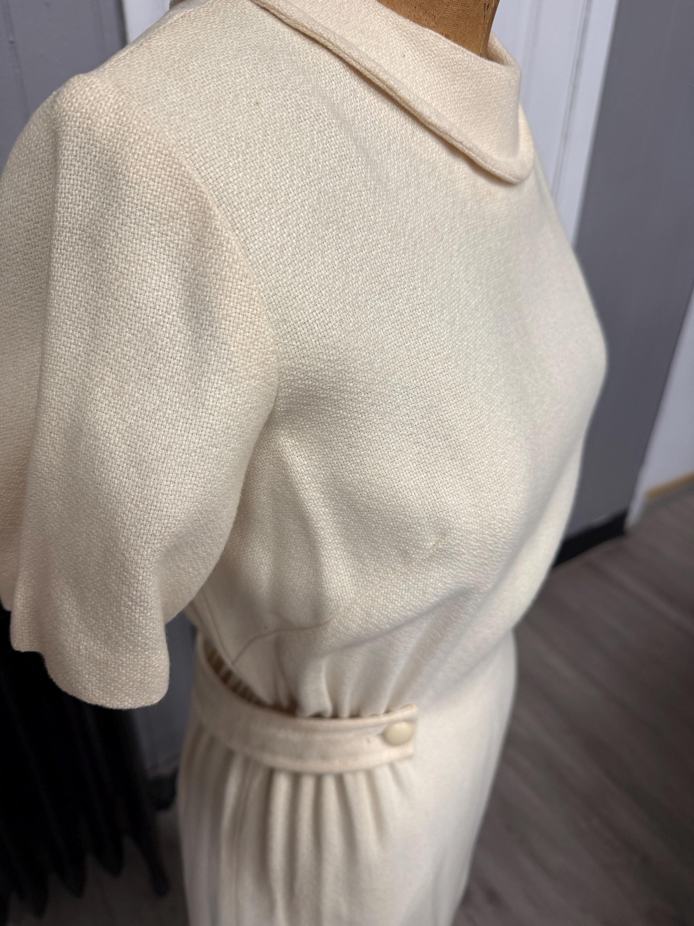 This is a lovely winter white, woven rayon dress from the late 50s, early 60s. I love a monochromatic look like this, with a sweet, belted waist, accented by matching buttons. The collar is a stitched-down detail and the dress is unlined. It is in perfect vintage condition, as it it deadstock and has been well stored. The tag is marked as a size 16, which would fit a modern size 10-12. Please see measurements below. This dress could easily be dressed down for daytime office wear, or paired with some colorful accessories and elevated for a glamorous night out.